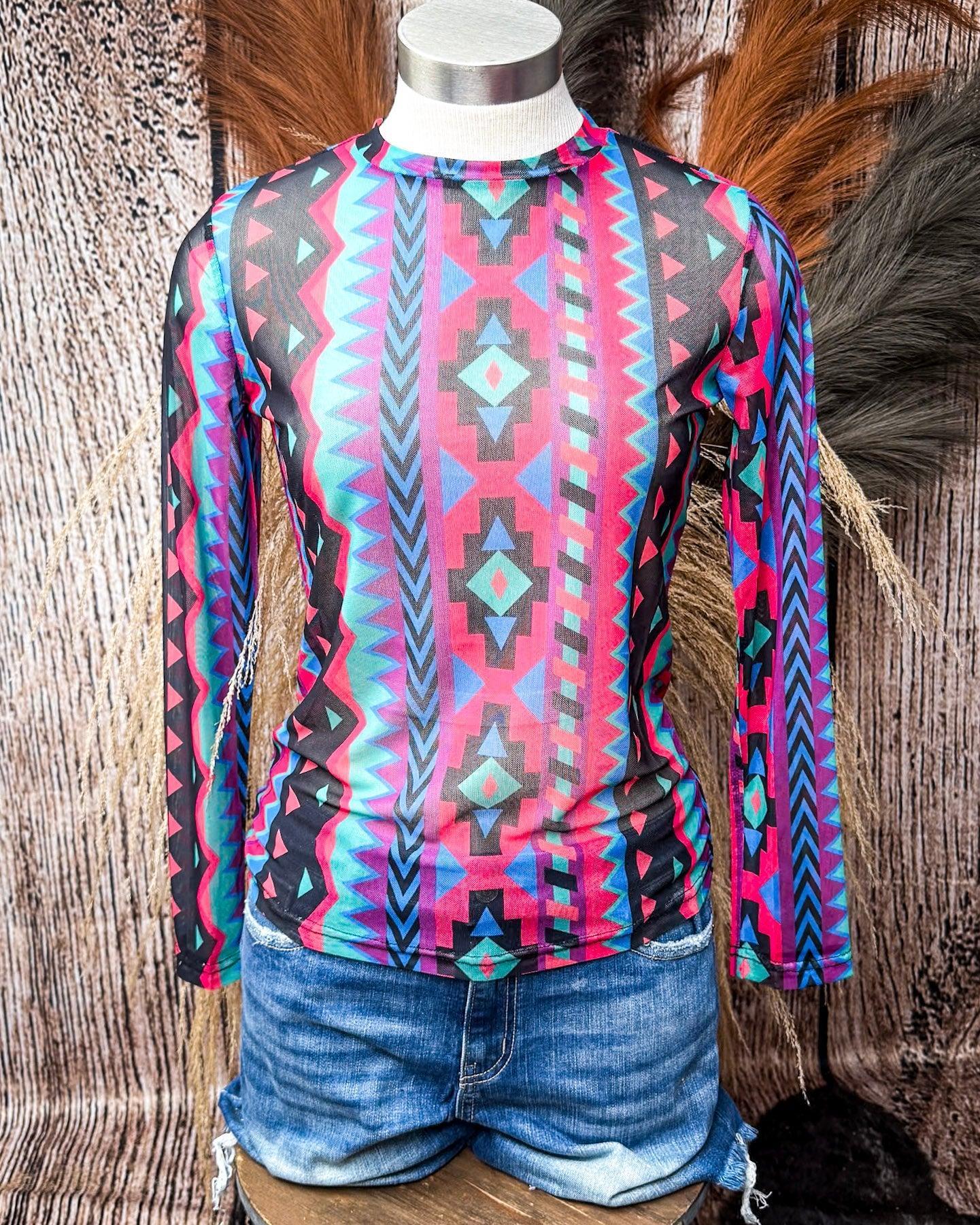 If bold is your middle name, the Retro Funk Mesh Top by Rowdy Crowd was made with you in mind. This isn’t just a shirt — it’s a full-blown personality piece. Bursting with vibrant Southwestern energy, it blends unapologetic color with a sleek, body-skimming fit that works as both a standout main act and a head-turning base layer.
