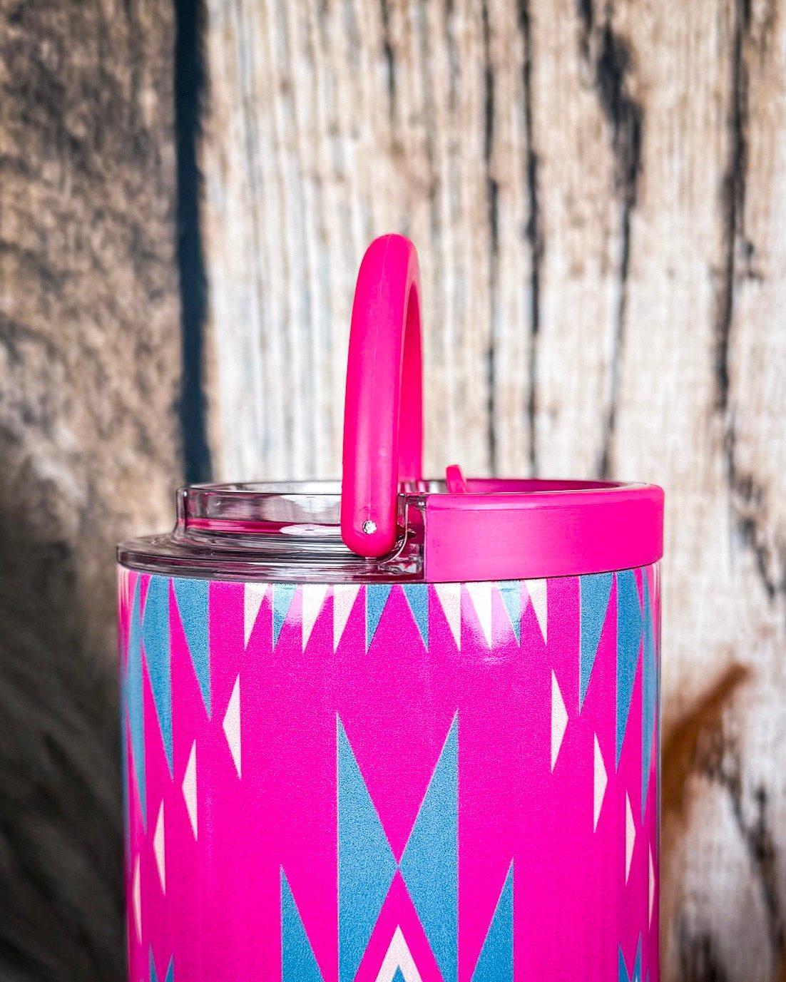 Stand out loud and proud with the Rodeo Rebel – 40oz Aztec Tumbler with Handle. Made for those who live bold, punchy, and unapologetically western, this tumbler delivers both style and performance in one fierce package. With its vibrant Aztec pattern in hot pinks, teals, and whites, it’s not just a drinkware essential—it’s a statement piece.