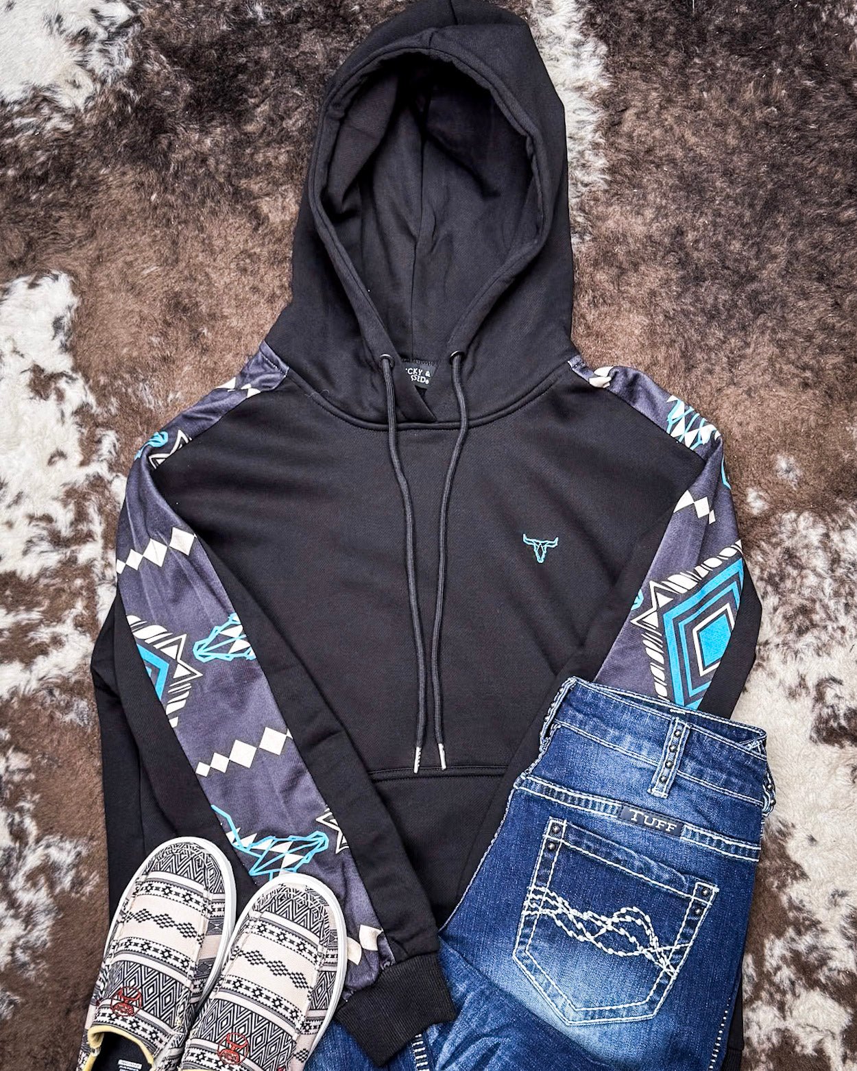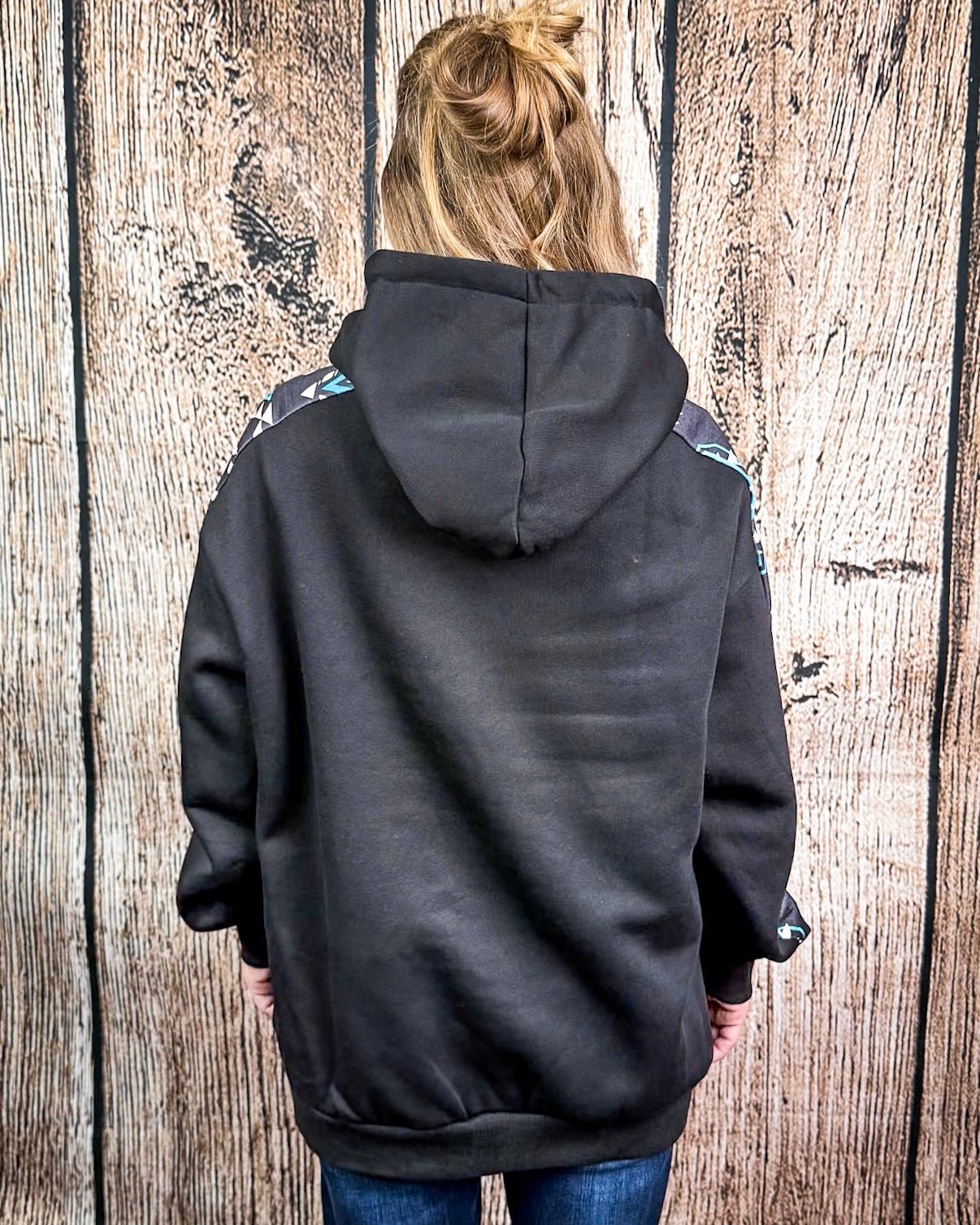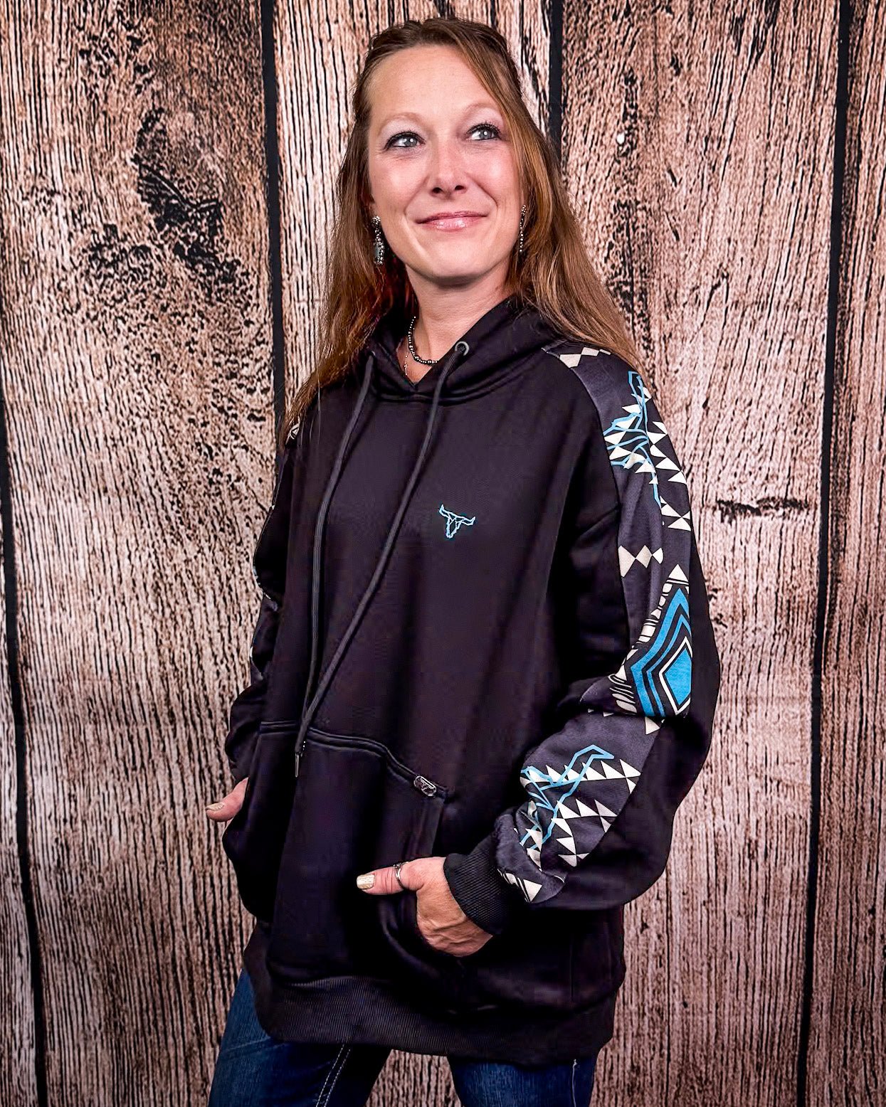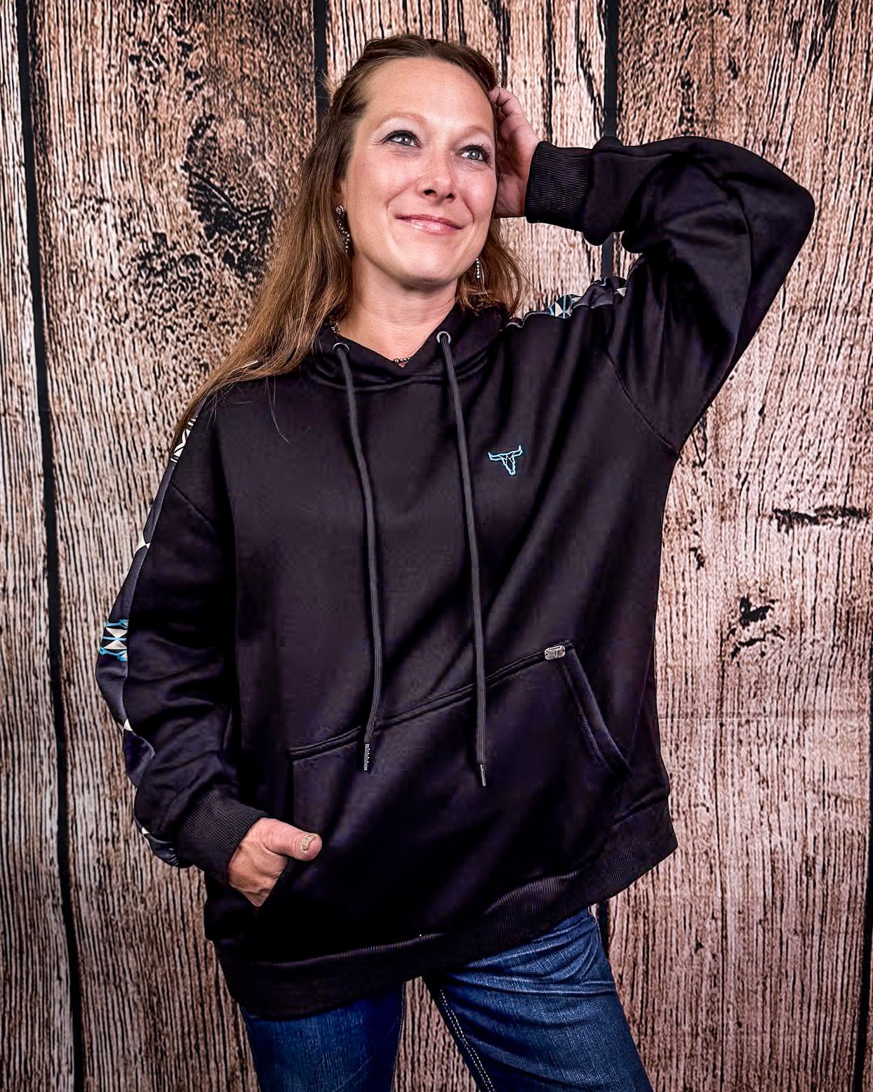 Crafted in classic black, this hoodie features a striking turquoise and white geometric Aztec pattern running down each sleeve. It’s the kind of bold detail that turns heads without trying too hard—just the right mix of everyday casual and western edge. Whether you're throwing it on over leggings for a cozy coffee run or pairing it with your favorite denim and boots, this pullover brings major outfit potential.