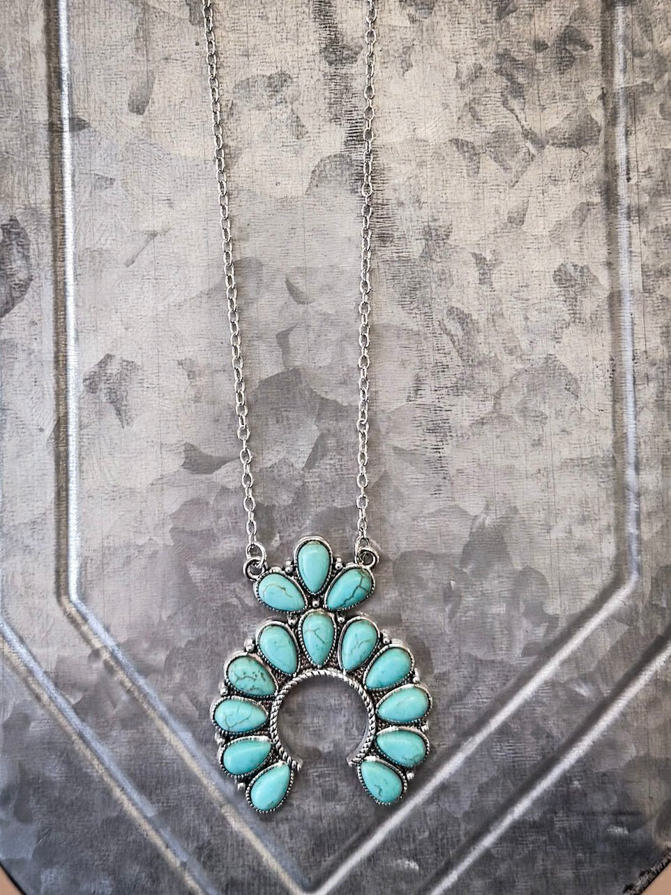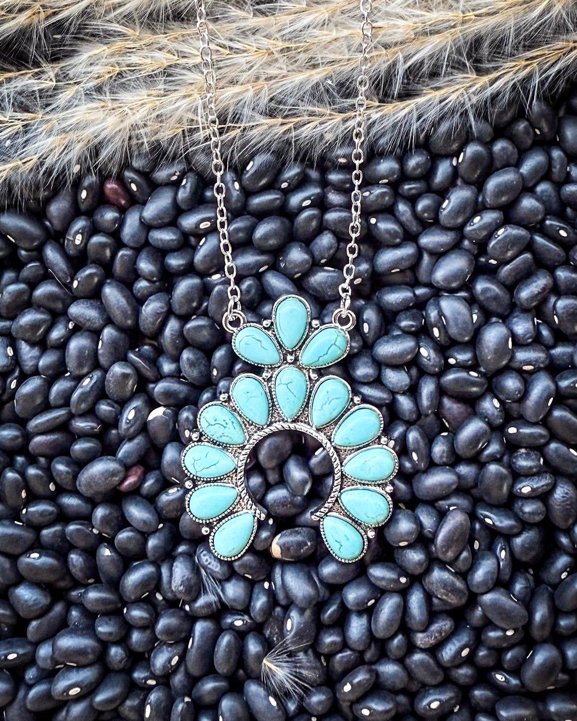 Drape yourself in Western tradition with the Squash Blossom Chain Necklace in Aqua—a piece that honors the past while making a statement in the present. Whether you're chasing sunsets, riding trails, or simply embracing the Western lifestyle, this necklace is ready to go wherever the journey takes you.