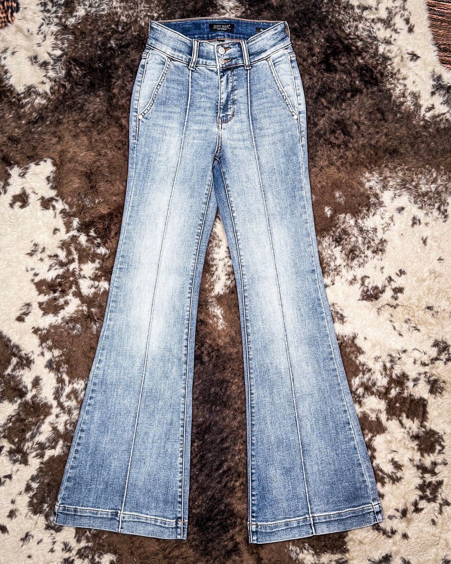 The Steph High Waisted Trouser Flares by Judy Blue bring timeless Western style together with modern comfort. With their clean, tailored lines, flattering high rise, and dramatic flare leg, these jeans are made for women who love their denim with a little extra personality.