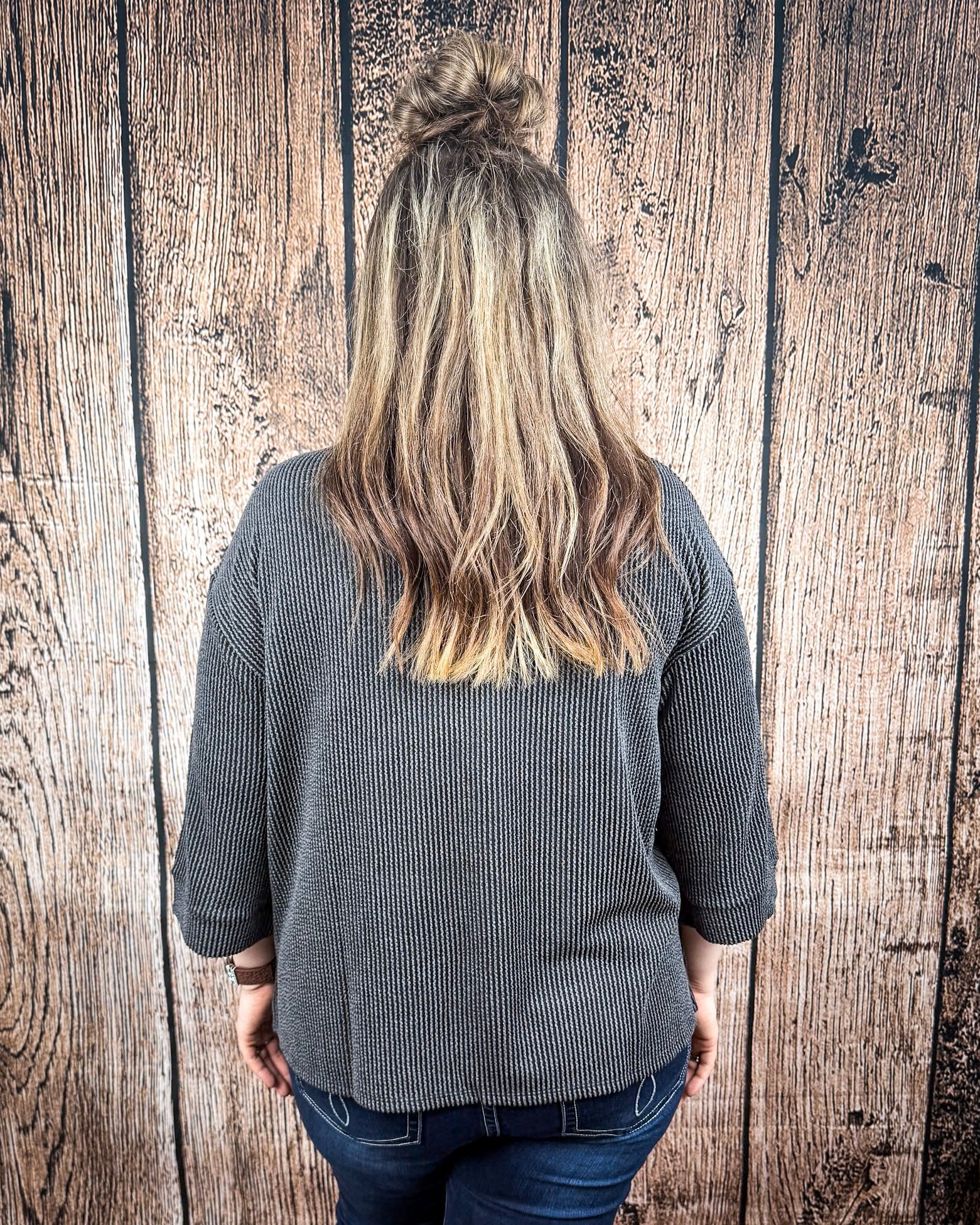What really sets it apart is the curly rib knit fabric. The texture adds depth and movement to a solid black top, giving it a subtle visual interest that goes beyond basic. The fabric is soft and stretchy, with a smooth feel that keeps you comfortable all day. It’s lightweight, breathable, and non-sheer—no layering needed.
