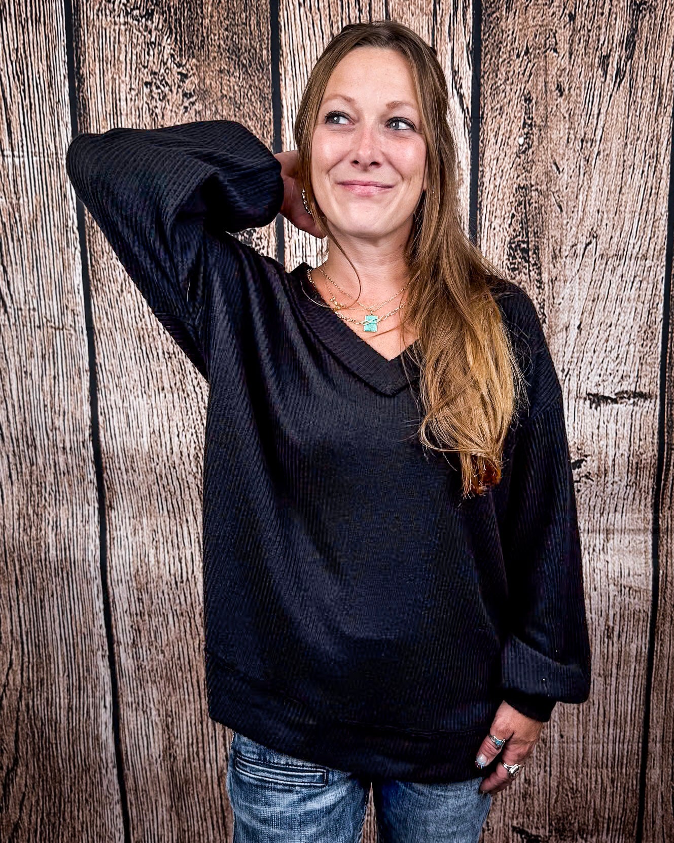 Not your average basic. The Hadley Top in Black brings a little something extra to your everyday wardrobe. With its flattering v neckline, banded trim, and soft ribbed knit, it’s made to feel comfortable while looking effortlessly put together. Think of it as your new go-to—easy to style, easy to wear, and anything but boring.