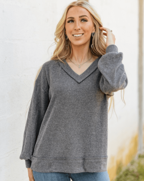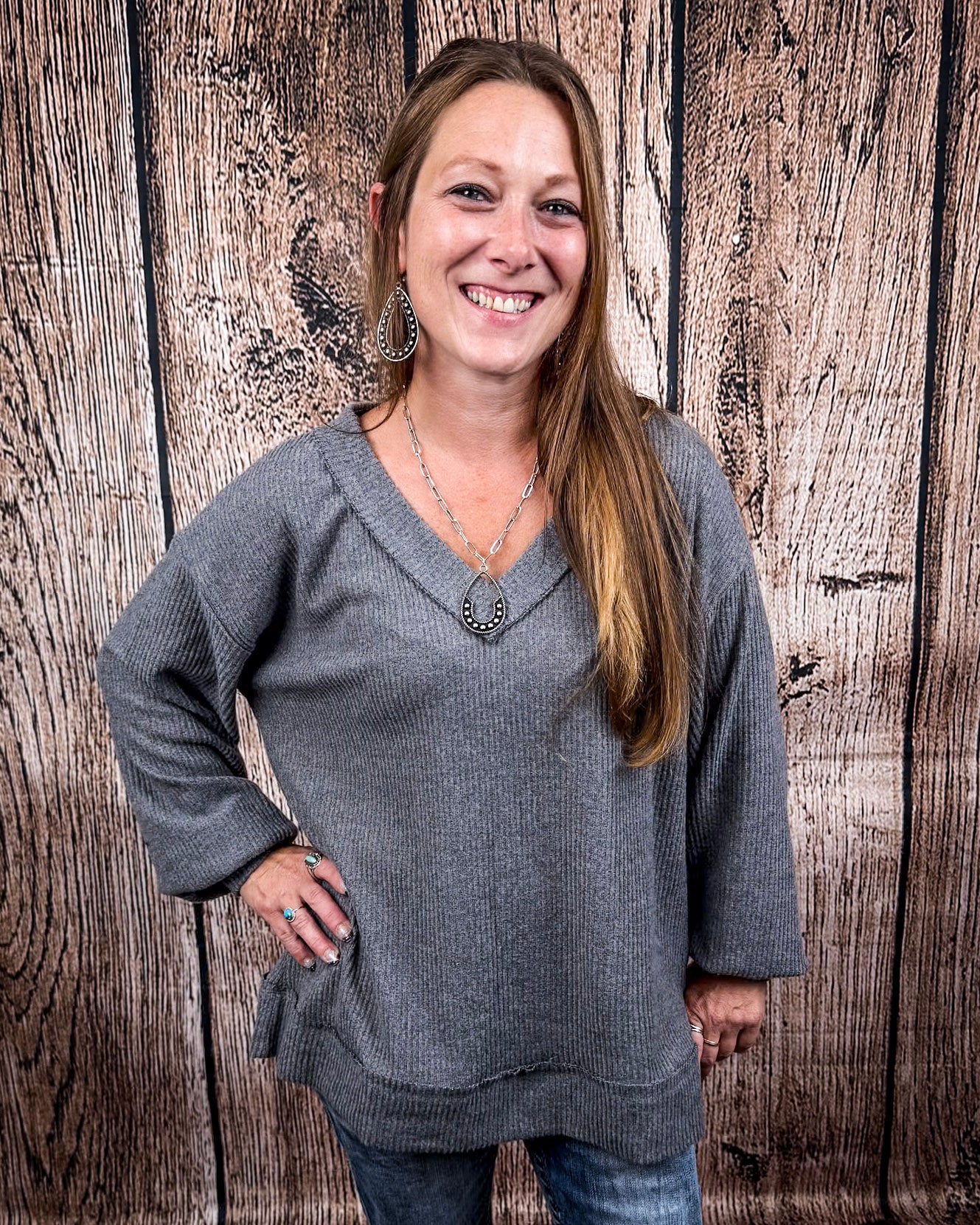 The standout details? A flattering v neckline with banded trim, ribbed texture throughout, and cuffed sleeves and hemline that add subtle structure to the shape. The silhouette is flattering— with a natural drape that pairs well with high-rise denim, leggings, or even a maxi skirt.