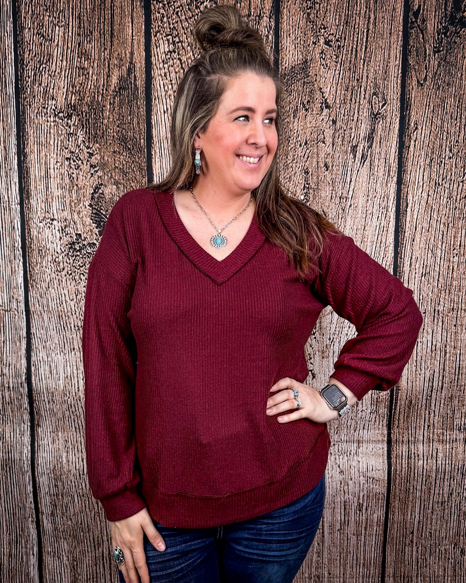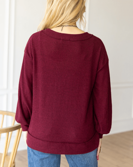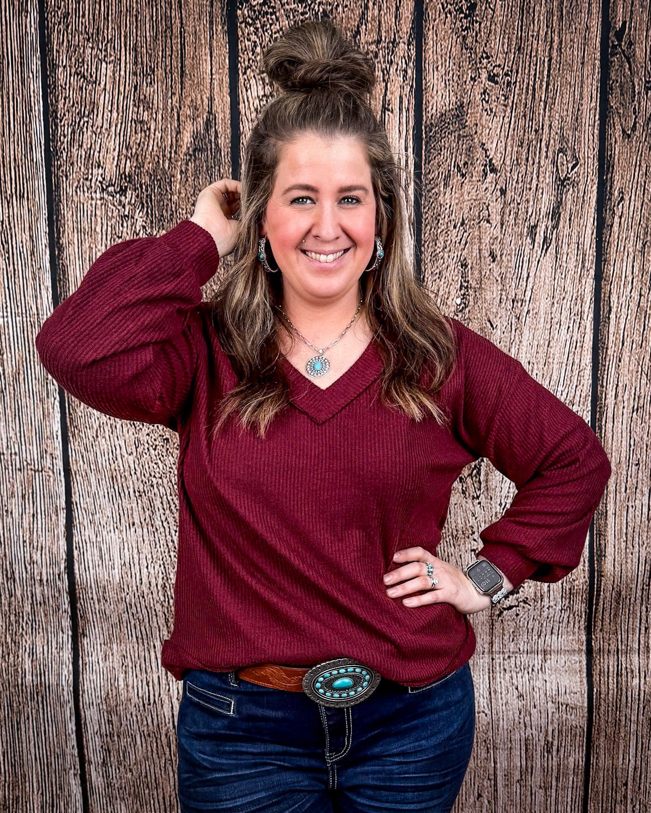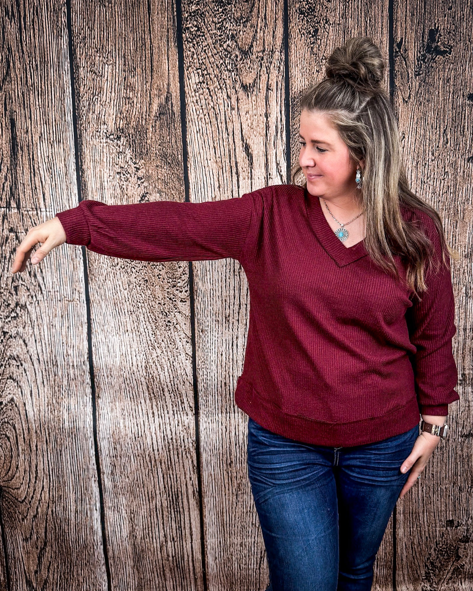 This Wine colorway brings warmth and depth to the piece, making it a go-to for fall, winter, and well into spring. It's bold enough to feel like a statement, but still neutral enough to pair with all your favorite denim and boots. Whether you’re headed to dinner, a casual get-together, or just throwing something on for the day, The Hadley Top in Wine adds just the right amount of color to your look.