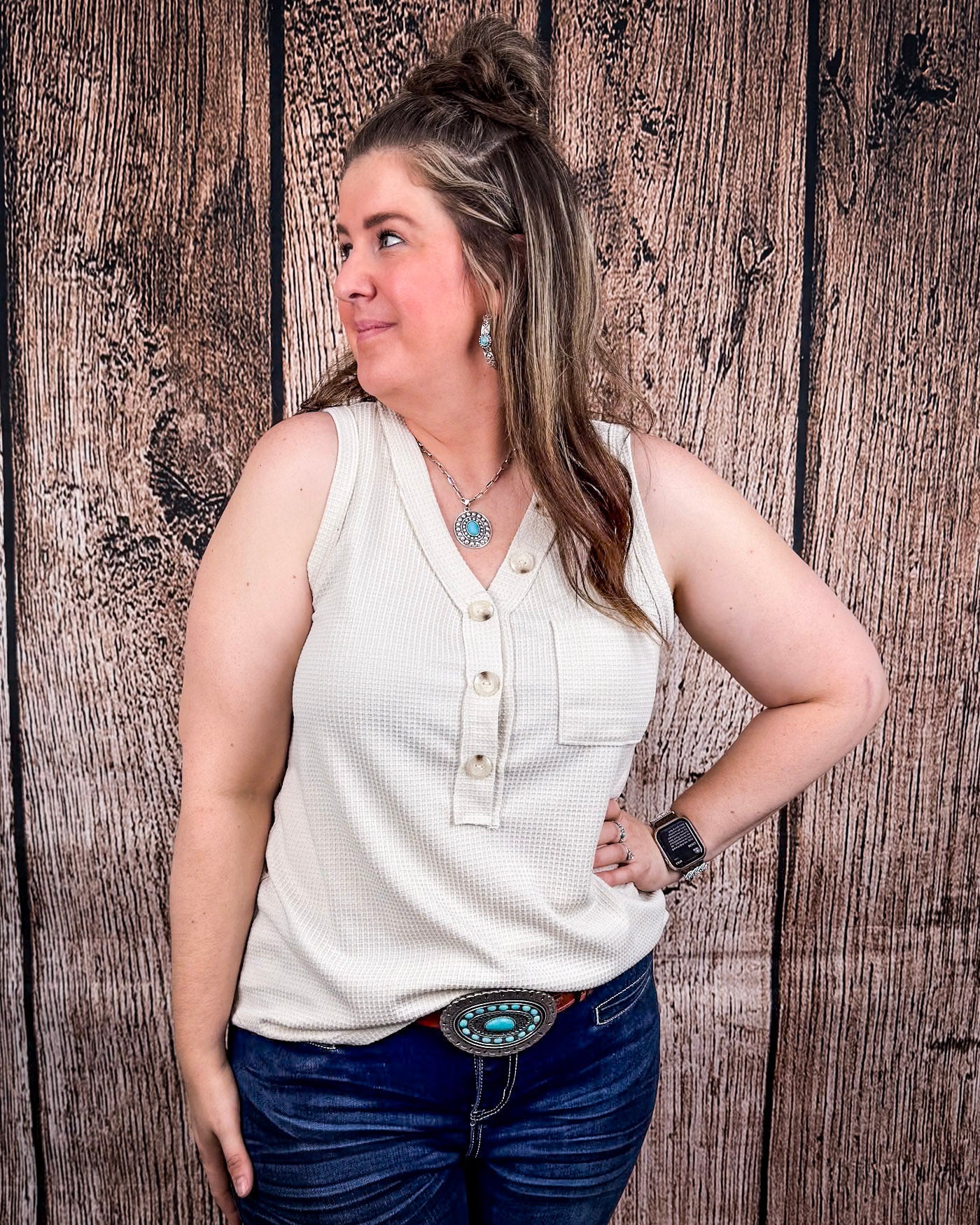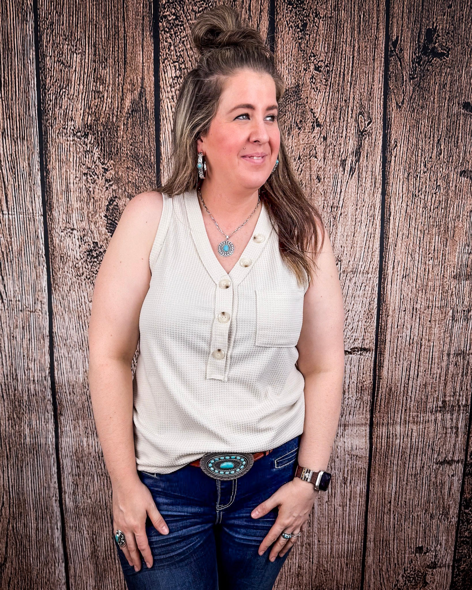 Neutral, lightweight, and full of charm—The Lanie Tank in Oatmeal brings a soft, feminine touch to your everyday style. Made from a breathable waffle knit with a true to size easy fit, it’s designed to move with you and keep you comfortable from sun-up to sundown. With a flattering v neckline, faux button front, and two functional front patch pockets, this tank has just the right mix of casual and cute.