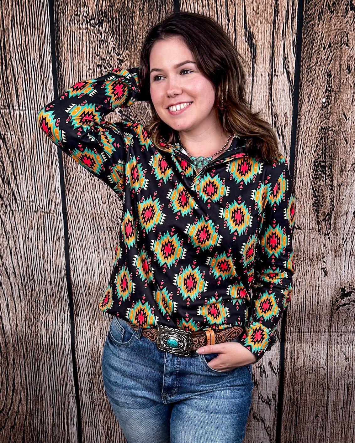 At the end of the day, the Palmer Pullover is for the woman who doesn’t just wear her clothes — she lives in them. It’s for those who embrace color, value comfort, and know that a little Western flair goes with everything. Slip it on and you’re not just getting dressed; you’re making a statement that says bold, confident, and unmistakably you.