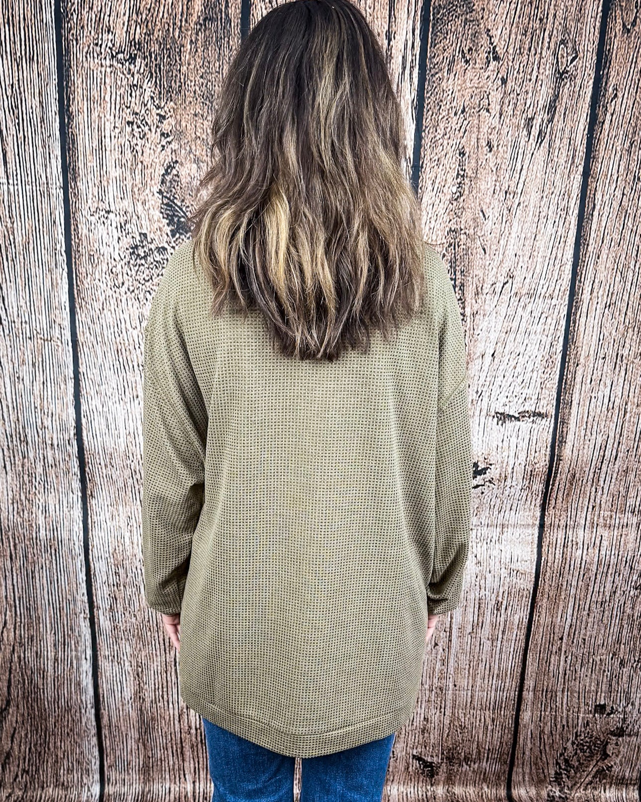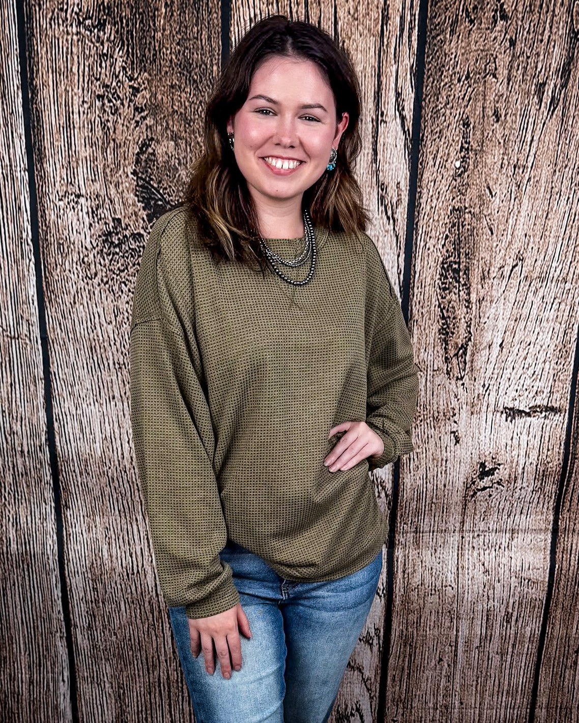 This top is crafted from a lightweight waffle-knit material that brings texture without being bulky. It’s cozy enough for cooler temps, but breathable enough to wear year-round. Toss it on solo during warmer months, or layer it up with jackets and scarves when the weather shifts. Either way, you’ll be reaching for this one more days than not.