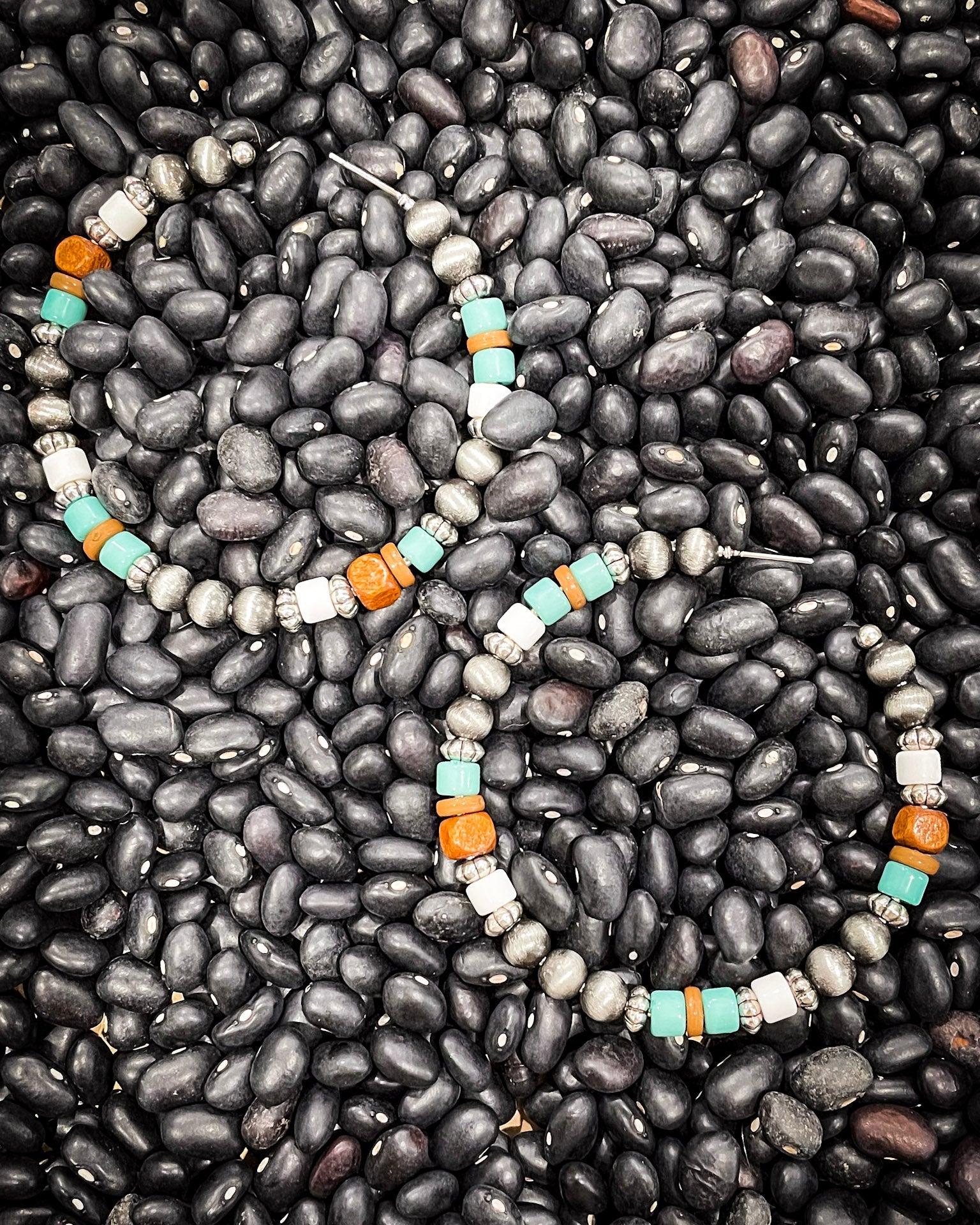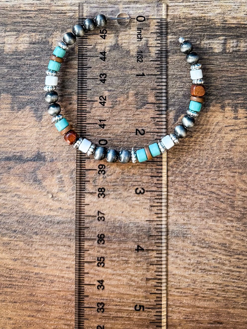 The Navajo-style faux pearls bring in that classic southwestern texture—muted silver with a worn-in, antique feel that plays beautifully against the pops of color. And those color-blocked beads? They’re giving sunset-in-the-desert energy. A little rugged, a little refined, and totally unique.