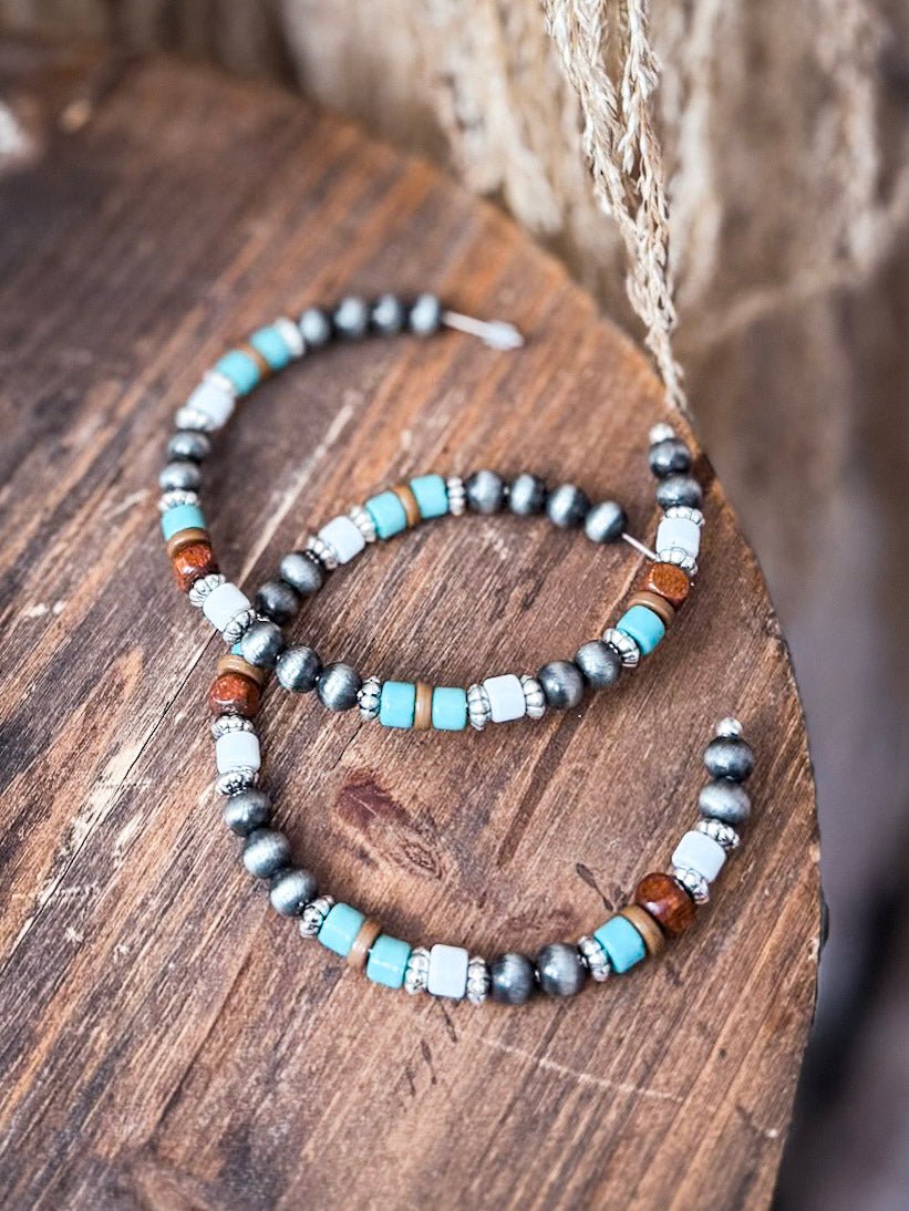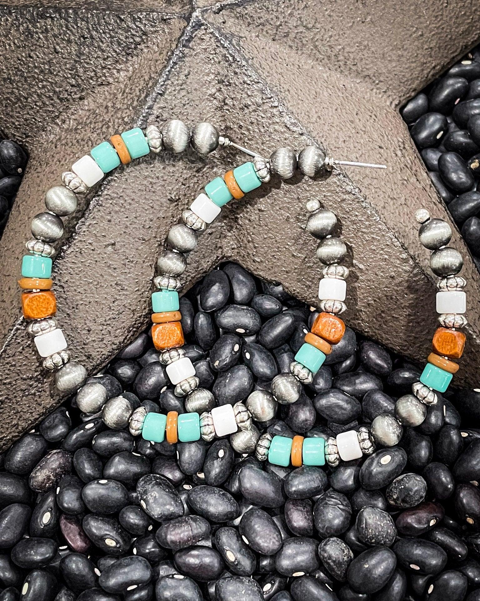 Measuring 2.25” across, these aren’t your average hoops. They’re big enough to stand out but lightweight enough to wear all day without a second thought. The standout feature? That mix of faux Navajo pearls paired with chunky turquoise colored beads, warm amber tones, and soft whites—each bead adding its own personality to the story. It’s like desert skies and canyon walls wrapped into one dreamy accessory.