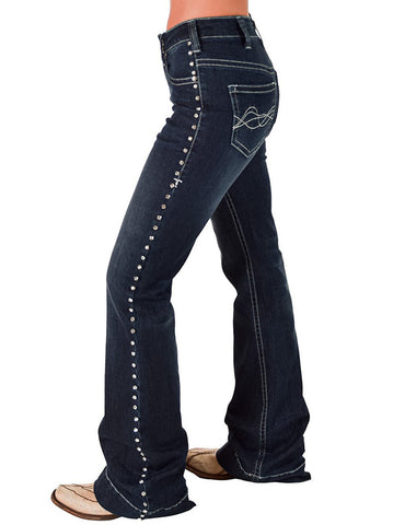 Shine bright and make an unforgettable entrance with the Cowgirl Tuff Grand Entry Jeans. These eye-catching dark wash trousers feature riveted crystal detailing that runs down both legs, creating a stunning shimmer effect that turns heads wherever you go.