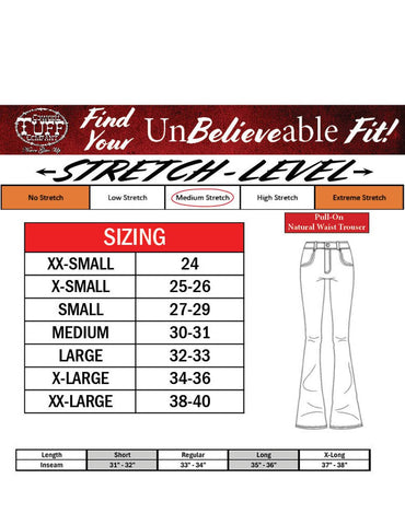 Tuff Flex Fabric – 68% cotton / 30% polyester / 2% spandex.