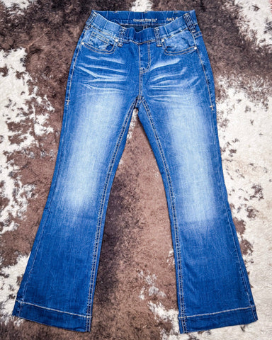 With a medium wash, light distressing, and subtle whiskering for a lived-in look, these jeans are perfect for riding, working, or heading out for a casual day in town. No buttons, no zippers — just effortless pull-on comfort that fits like your favorite pair from day one.