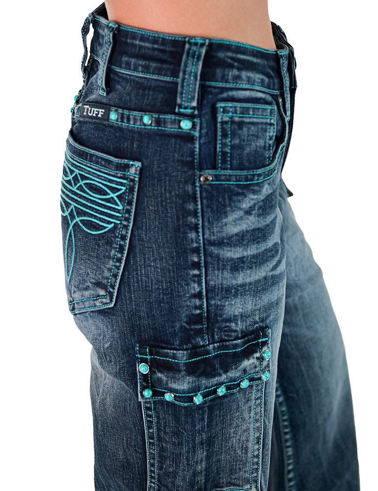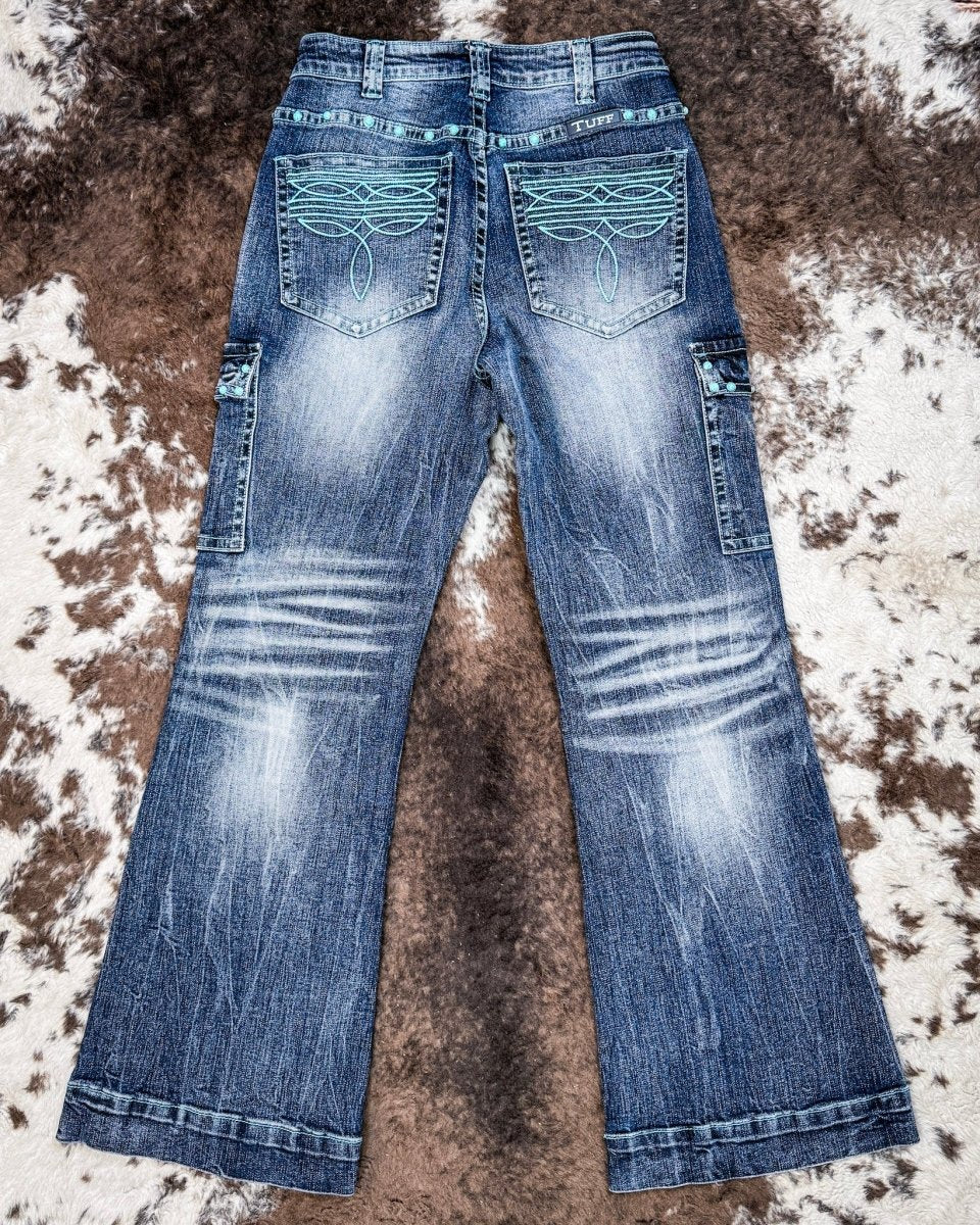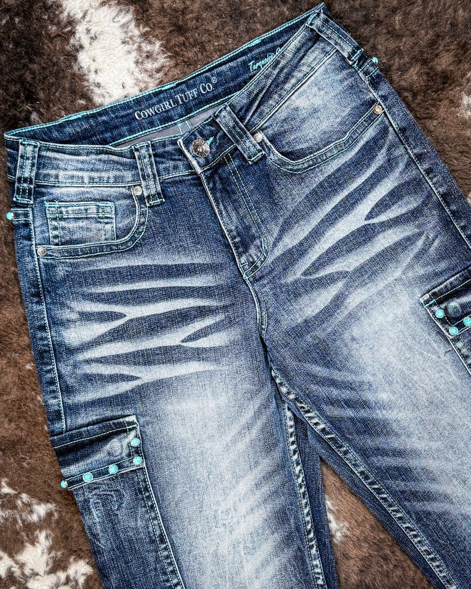 What sets this style apart is the turquoise stud detailing along the cargo-style side pockets and back yoke. The accents add dimension and visual interest without overpowering the design, making these jeans easy to dress up or down. The medium wash denim is finished with natural whisking and wear patterns that give the jeans depth and character while keeping the overall look polished.