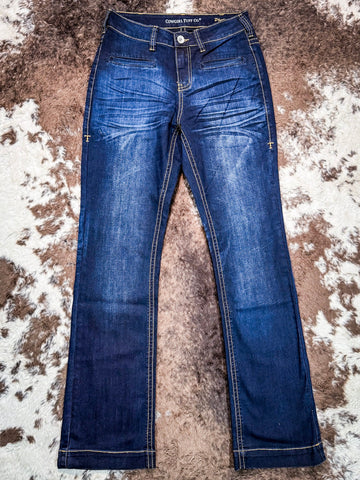 The overall gold stitching provides a striking contrast against the deep wash, adding just the right amount of bold detail without overpowering the jeans' refined design. This signature touch makes them a perfect match for a collection of hoodies or pullovers, creating an effortlessly coordinated look that embodies timeless western fashion. Whether paired with a classic chambray shirt, a graphic tee, or a statement jacket, these jeans offer endless styling possibilities.