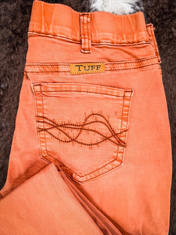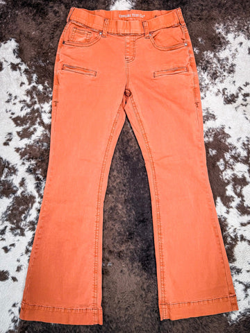 Step into effortless style and comfort with the Cowgirl Tuff Rusty Pull-On Trouser Jeans, a must-have for anyone who loves a chic yet practical wardrobe staple. The first thing you'll notice is the stunning rust-colored wash, a rich and earthy hue that adds a unique touch to your denim collection. Whether you're dressing up for the office, heading out to a special event, or keeping things casual, these trousers will elevate your look with their clean, sophisticated design.