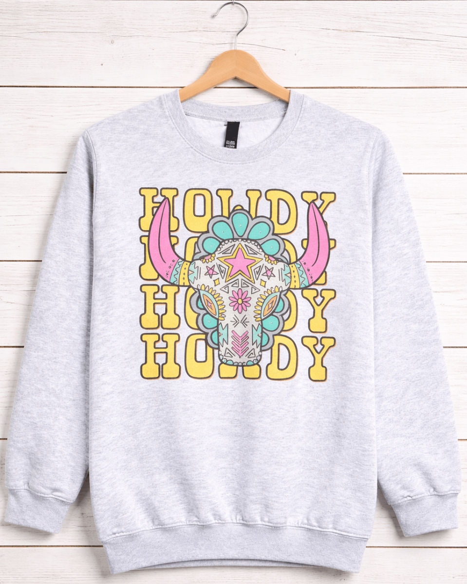 Make a bold statement with this Howdy bull skull sweatshirt, designed for the modern cowgirl who loves standout color with a polished western edge. Set on a classic gray base, the graphic features layered “Howdy” lettering behind a detailed bull skull filled with turquoise, pink, and golden tones. Subtle rhinestone accents add just the right amount of shimmer without overpowering the design.