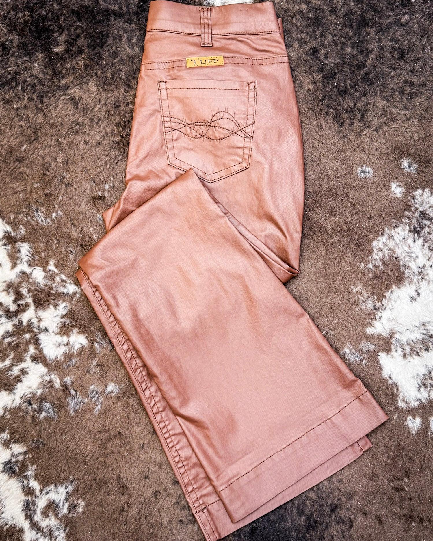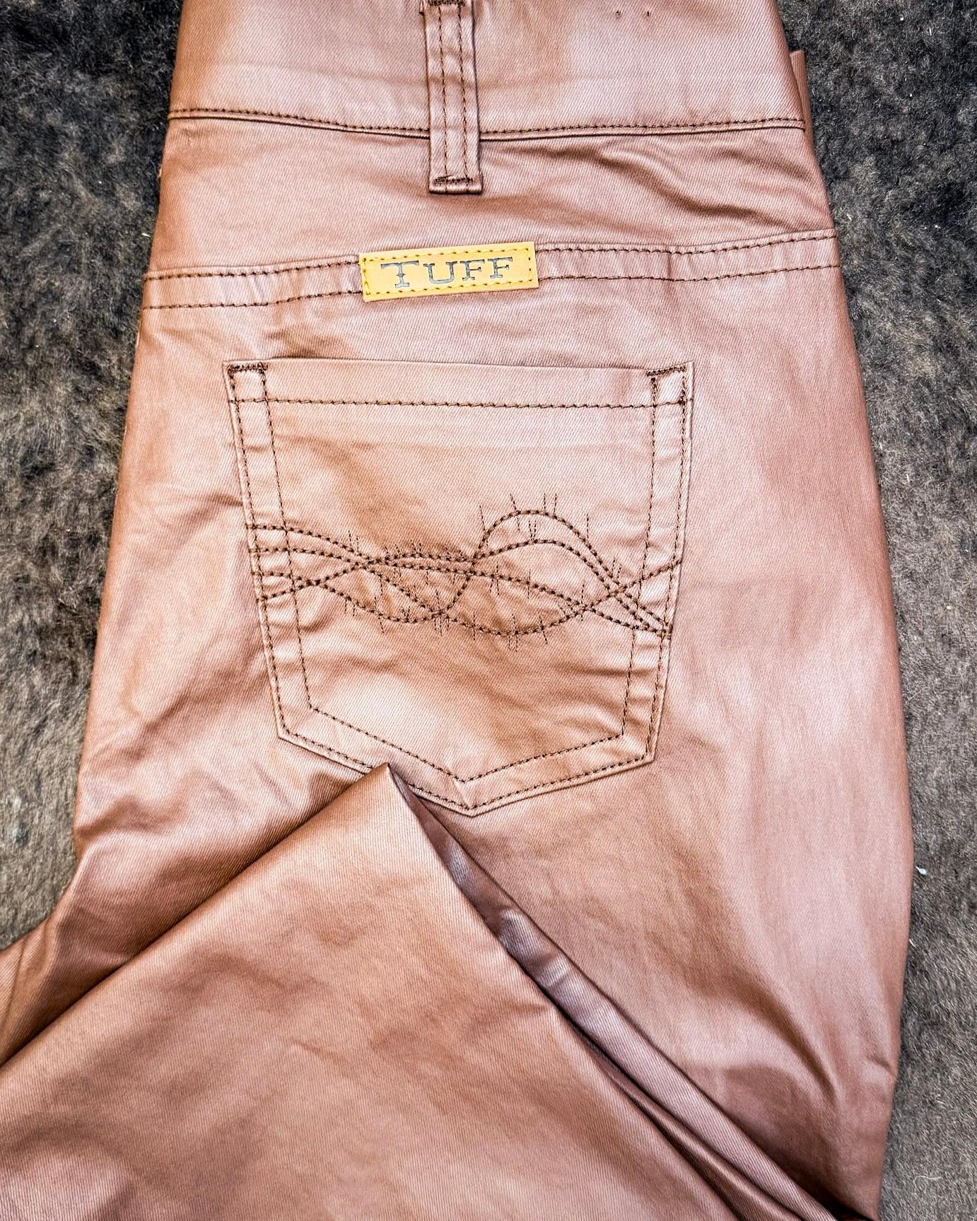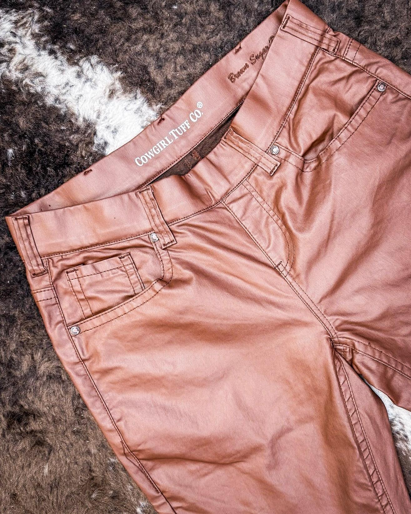 If you’re ready to spice things up with something bold yet easy to wear, the Cowgirl Tuff Brown Sugar Pull-On Trouser Jeans are your new go-to. Equal parts comfort and statement, these faux leather trousers are made for the woman who’s not afraid to stand out—whether she’s catching a concert, heading to a rodeo, or turning a casual night into something a little extra.