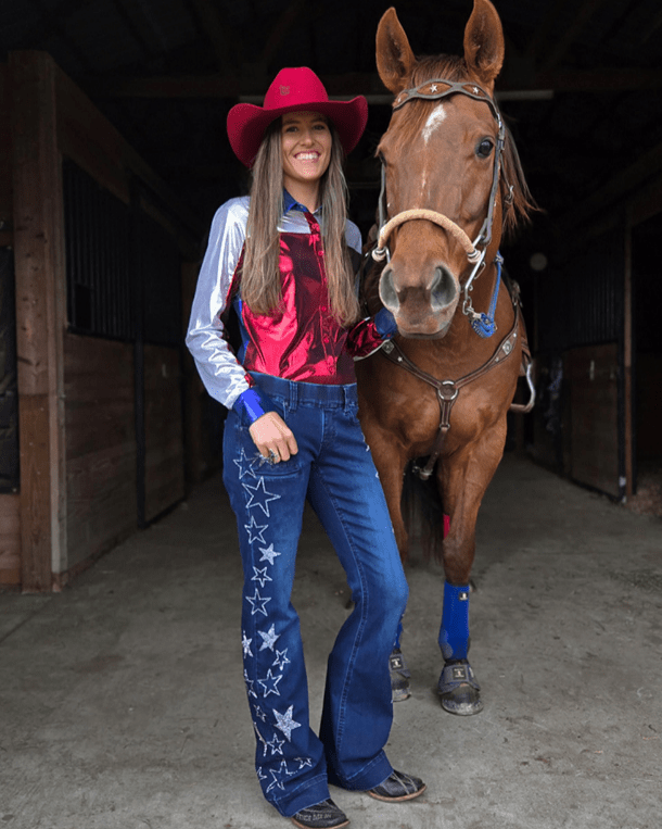These jeans are designed for the cowgirl who’s not afraid to stand out. Covered in shimmering rhinestone star designs from the hip all the way down the leg, these trousers don’t just walk into a room—they shine. Whether you’re headed to a concert, rodeo, or just want to add a little dazzle to your everyday, these jeans are here to make sure all eyes are on you.