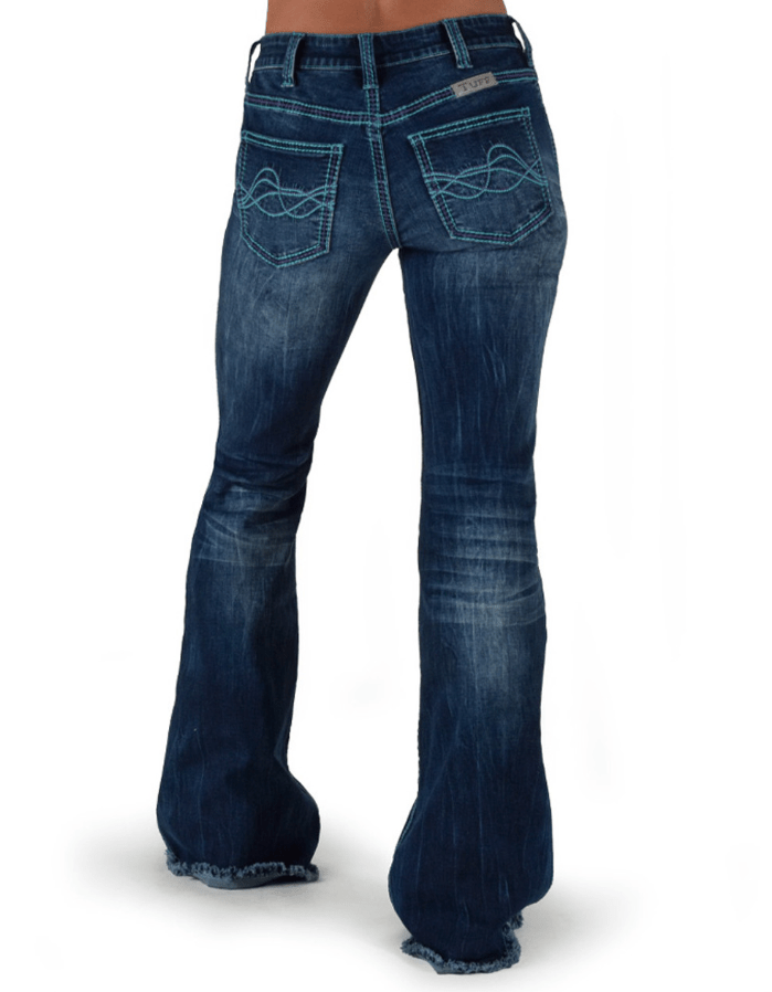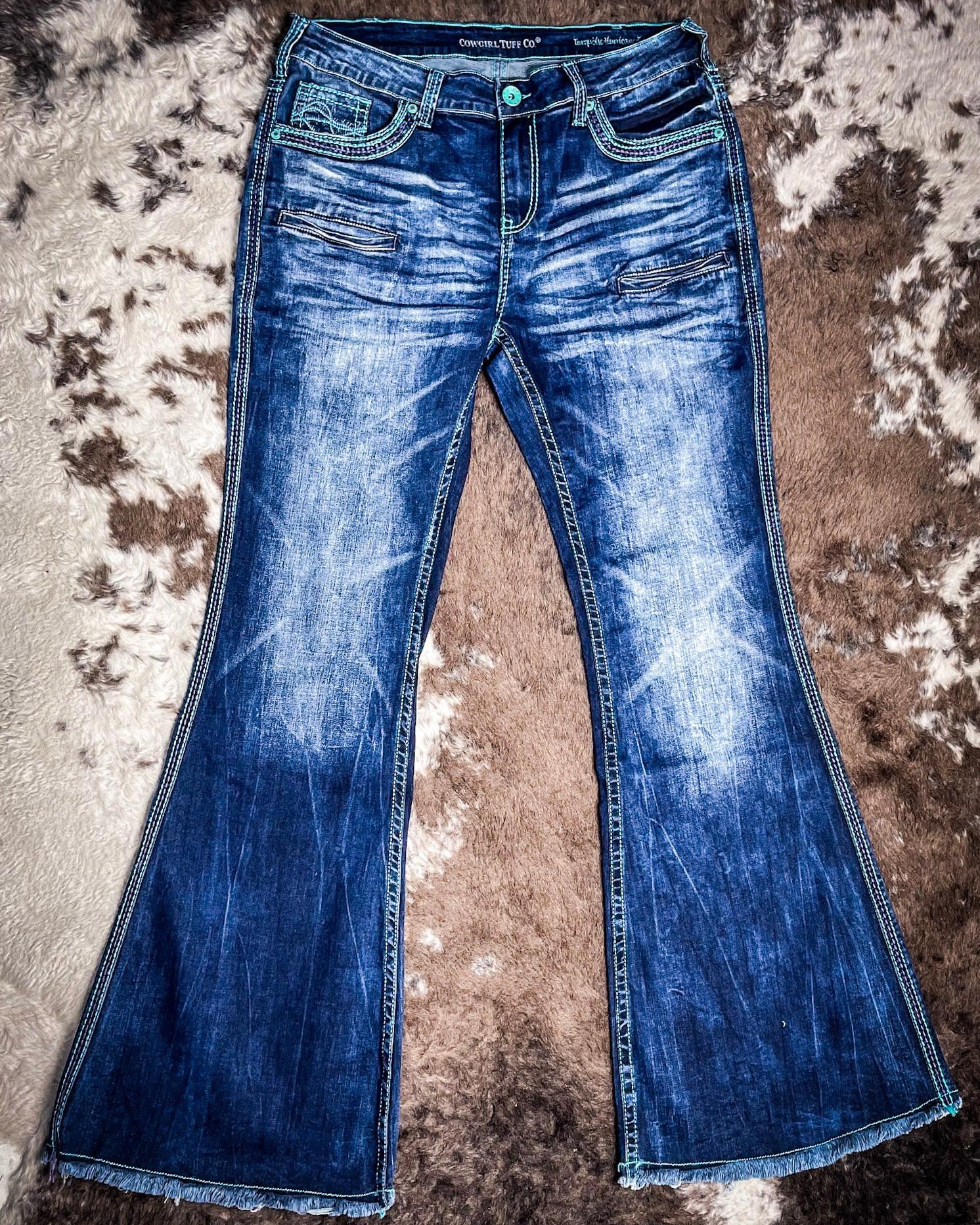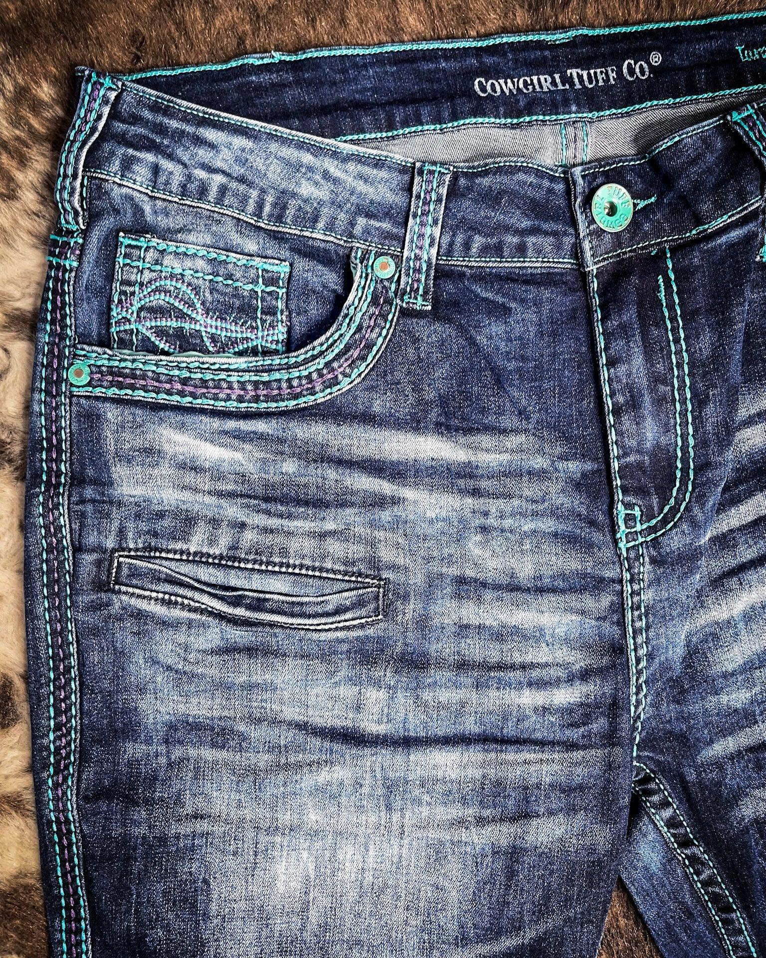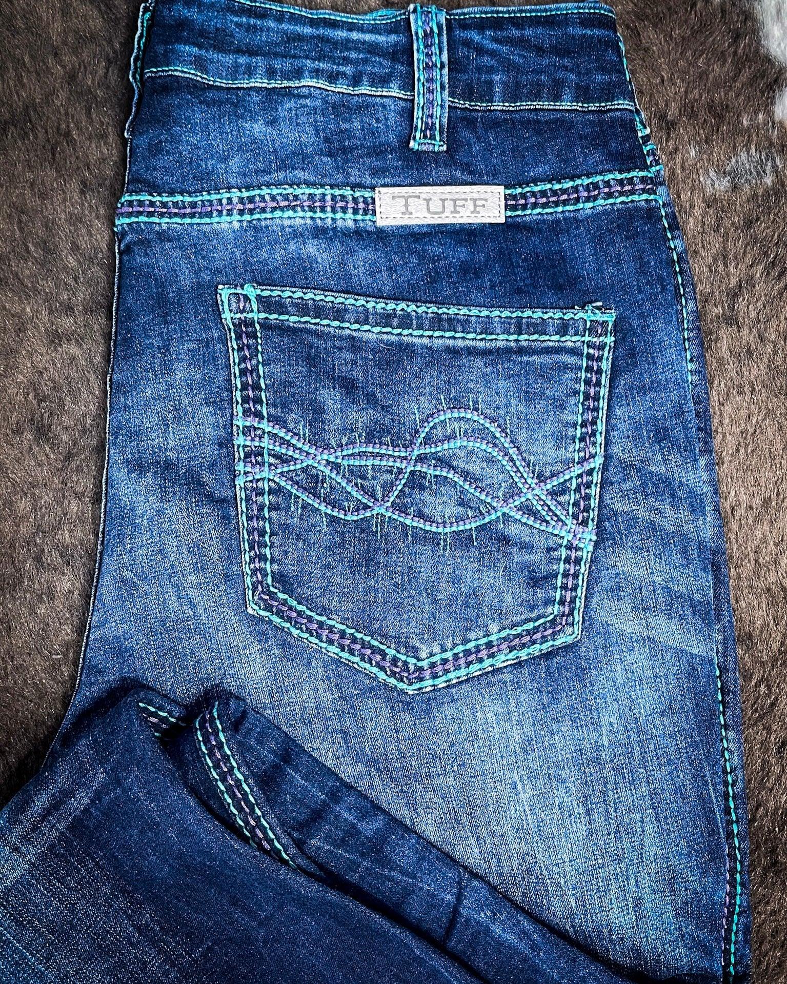 Say hello to your new showstopper: these Natural Waist Tuff Flex Trousers are serving up style, comfort, and function all in one unforgettable pair. From the bold details to the comfy fit, they’re the kind of jeans that’ll have folks asking, “Where’d you get those?”Let’s start with what you can’t miss—the Turquoise & Purple overall stitching. It’s bright, fun, and gives these jeans the perfect pop of color against the rich medium wash. Add in the turquoise rivets and button, and you’ve got a statement pair that’s every bit as bold as you are.