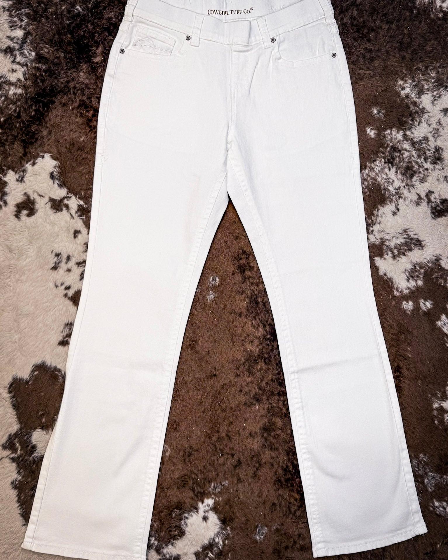 Whether you're performing, competing, or just soaking up a summer day, the Cowgirl Tuff White Pull-On Bootcut Jeans are made to move with you. Clean, bold, and built with comfort in every stitch—this is the jean you didn’t know you needed until now.