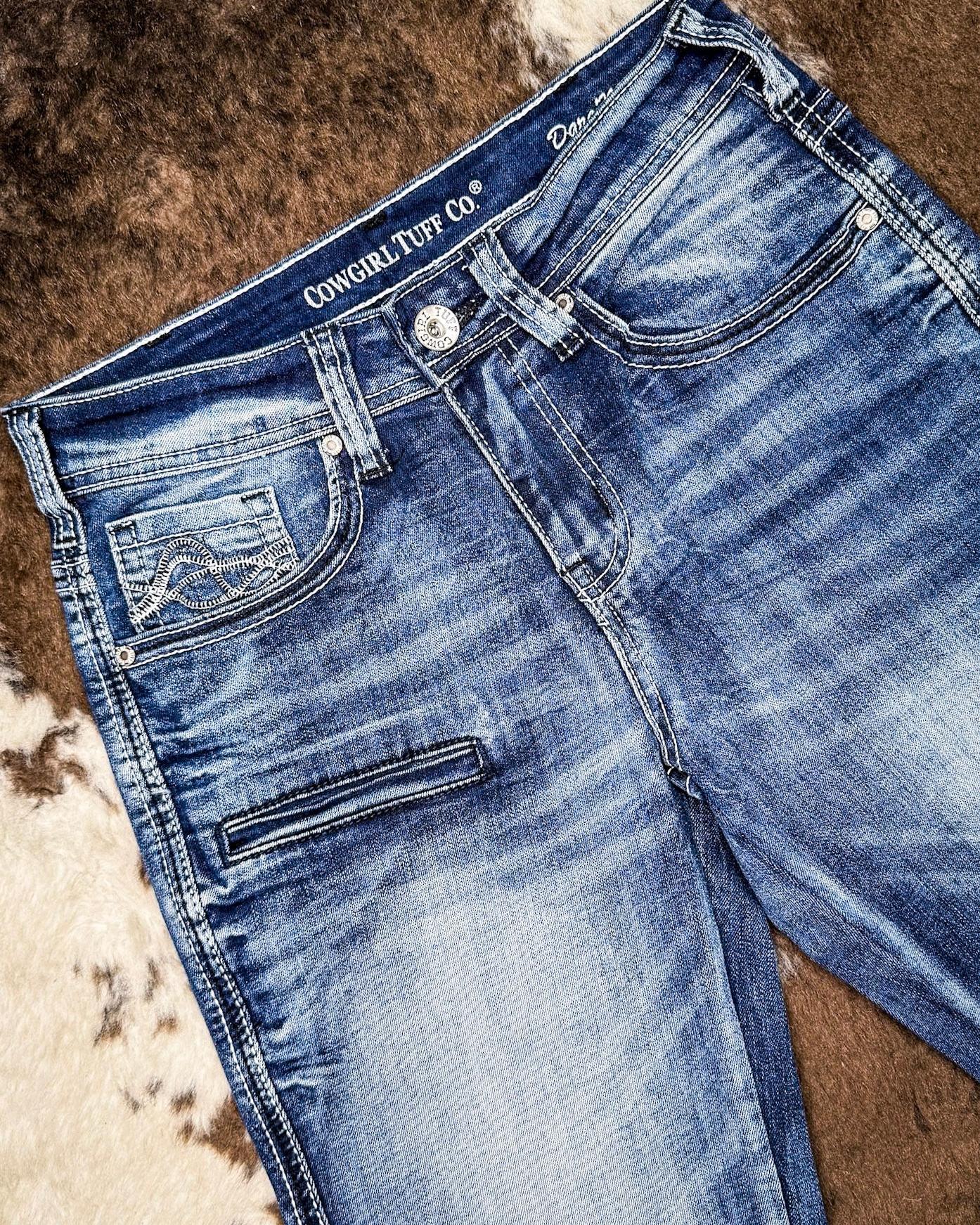 Made with Cowgirl Tuff’s signature Tuff Flex denim, these jeans are built for movement. They’ve got a medium stretch that gives you room to breathe while still holding their shape (no sagging halfway through the day). Designed to sit at your natural waist, they offer a secure, flattering fit that hugs through the hips and thighs, then kicks out into a bold flared trouser leg with a wide cuff hem. It's that balance of structure and ease that makes them a staple.
