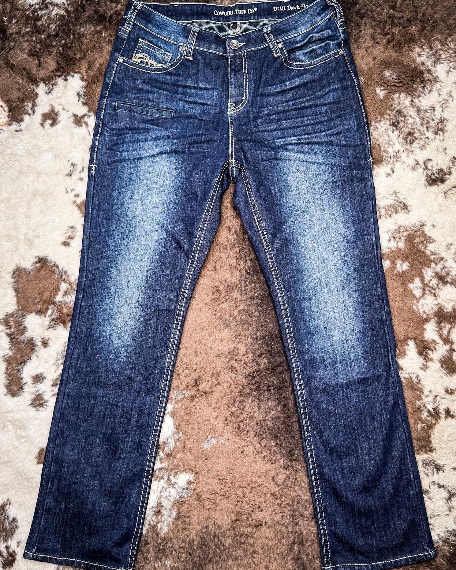 The dark indigo wash is rich and classic, perfect for styling up or down depending on your day. It’s accented with Cowgirl Tuff’s signature triple-color stitching, adding just the right amount of detail without being too flashy. And let’s not forget that signature barbed wire embroidery on the back pockets—it’s a subtle nod to the “Don’t Fence Me In” spirit we know and love.