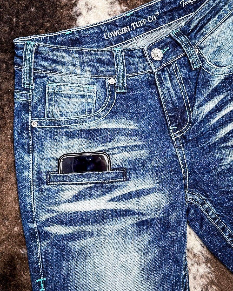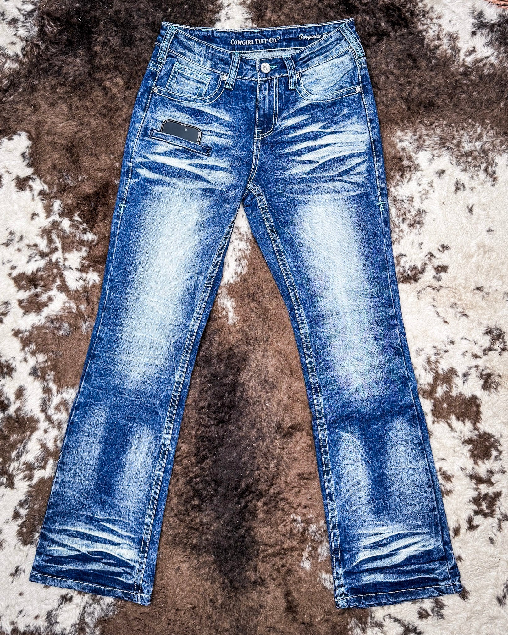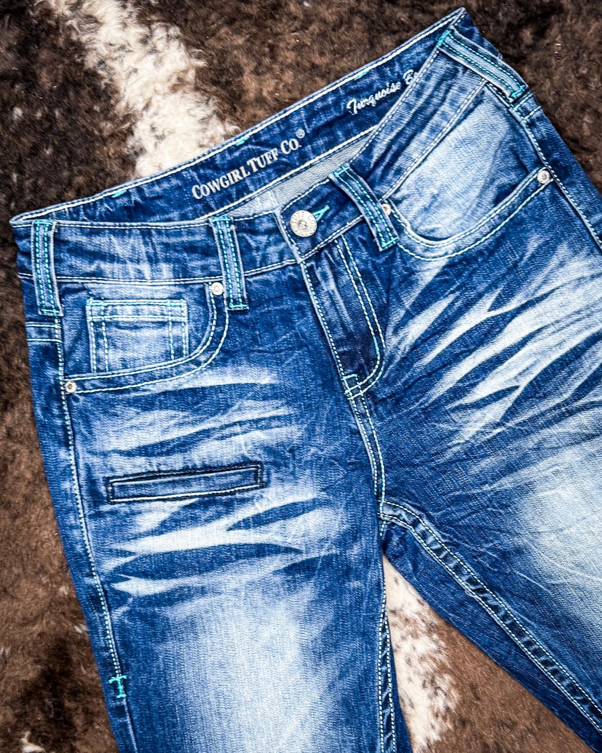Bright, bold, and built to last, the Turquoise Boot Stitch Bootcut Jeans by Cowgirl Tuff are made for women who want a little extra flair with their function. These jeans take everything you love about a classic bootcut and add a fresh twist with standout details, durable construction, and that signature Cowgirl Tuff fit.