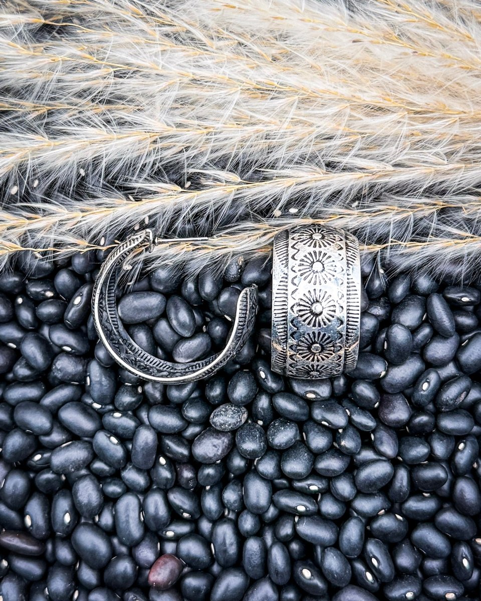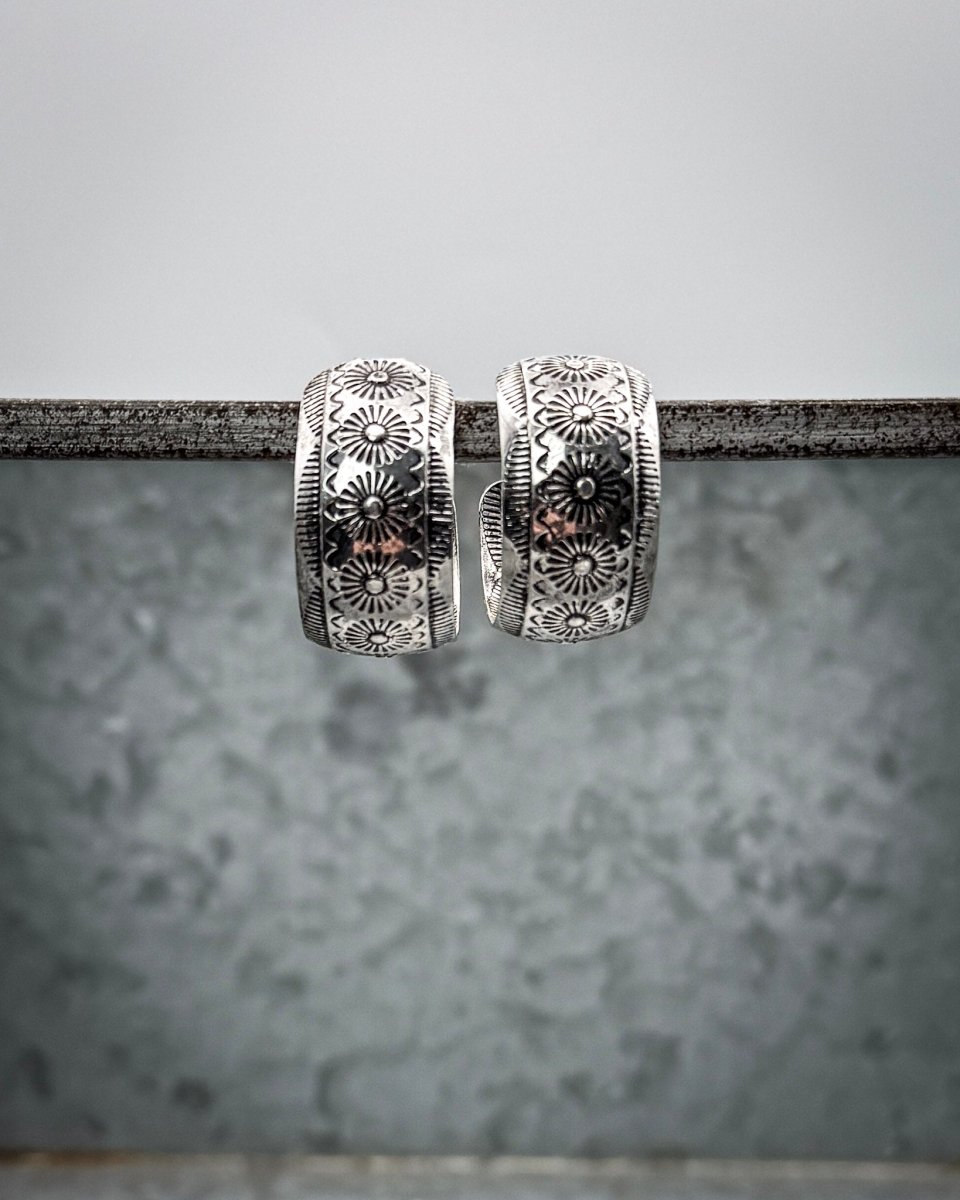 The Ardell Textured Hoop Earrings offer a refined take on a classic silhouette, blending softly antiqued silver tones with detailed patterning for a look that feels both modern and artisanal. Each hoop features an engraved design inspired by traditional metalwork, adding depth and dimension while maintaining a clean, versatile profile.