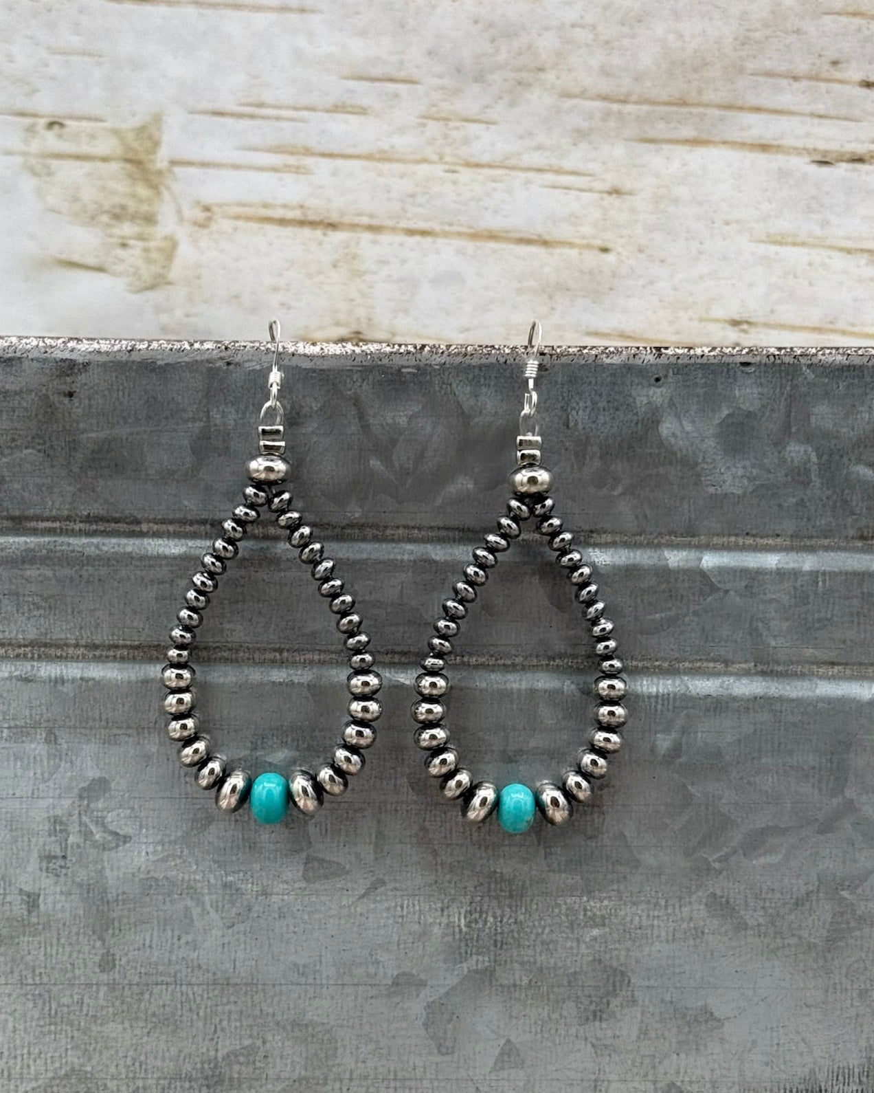 Built with 4mm, 5mm, and 6mm 0.925 sterling silver saucer pearls, each pair is shaped with a gentle curve that flatters without overwhelming. The focal point? A single 6mm Mexican turquoise bead at the base—every stone slightly different in color and matrix, giving you a pair that’s uniquely yours. Some are a little bluer, some a little earthier—but all of ’em bring that raw, natural beauty that makes turquoise such a staple in western style.
