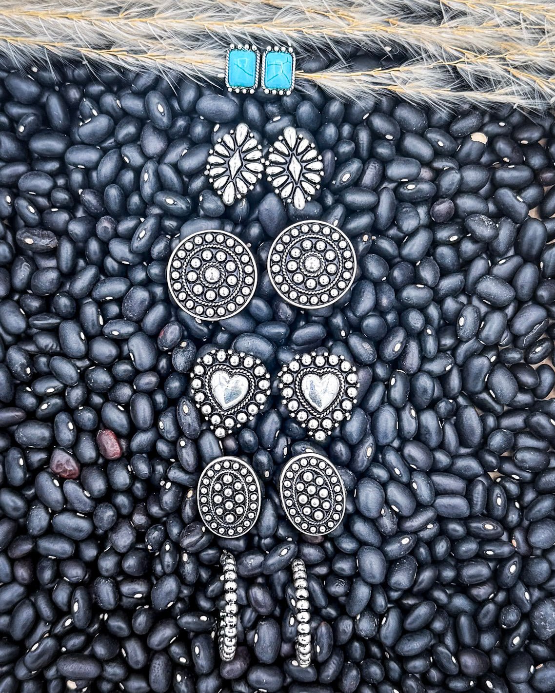 Western-inspired designs: engraved hearts, conchos, turquoise-look stones, hoops, and more