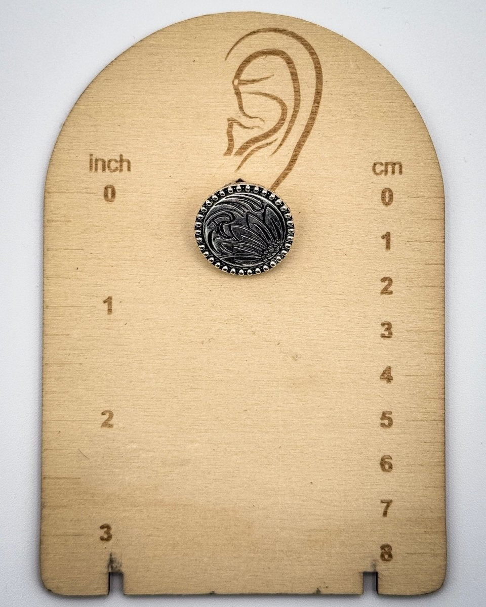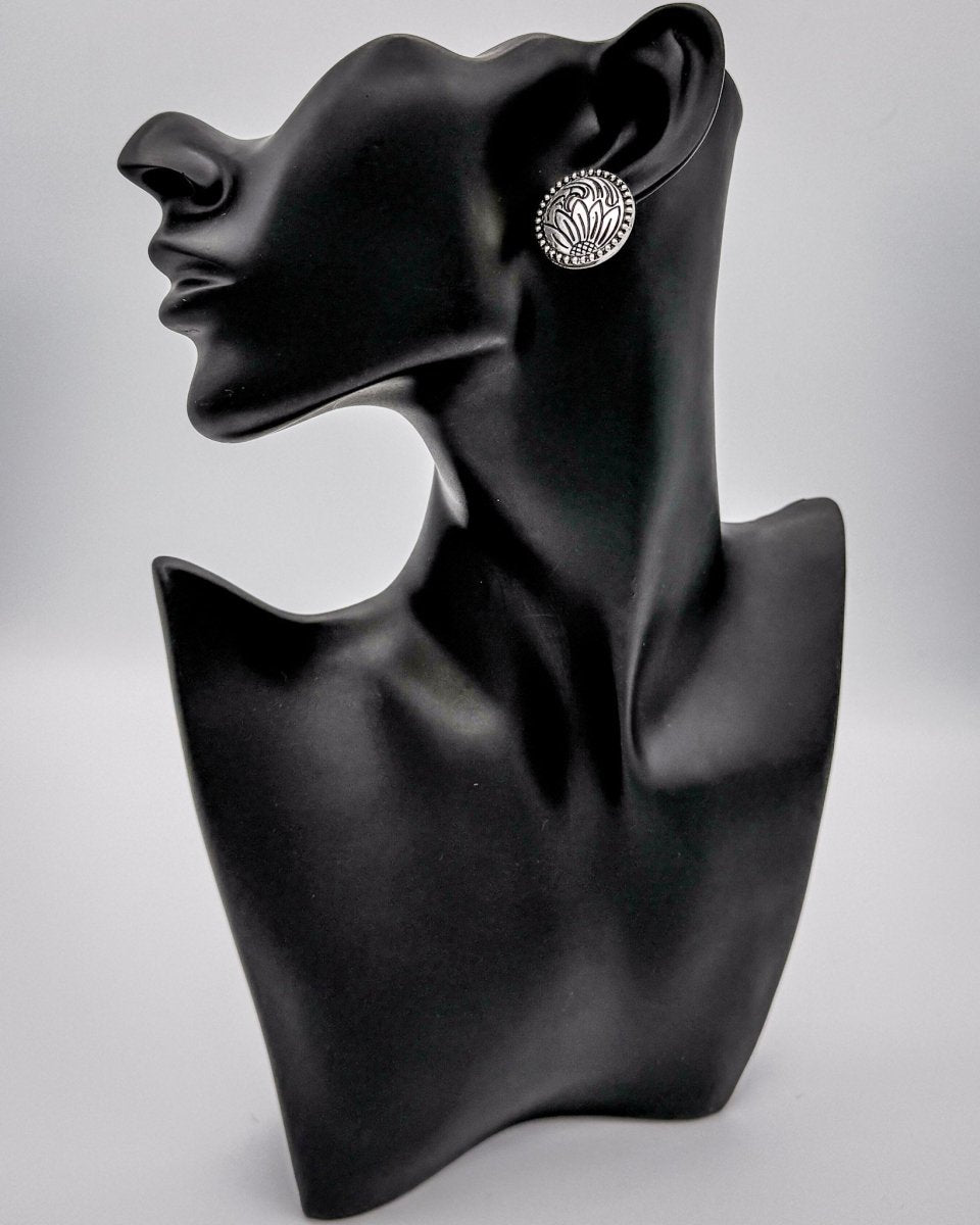 Each earring features a stamped floral design with soft curves and bold contrast, all framed by a raised silver beaded edge. At just .75" wide, they sit comfortably on the ear and add that subtle shine you can wear anywhere. Whether you're keeping things casual in a tee and jeans or dressing up a bit for date night, these studs have a way of finishing the look without trying too hard.