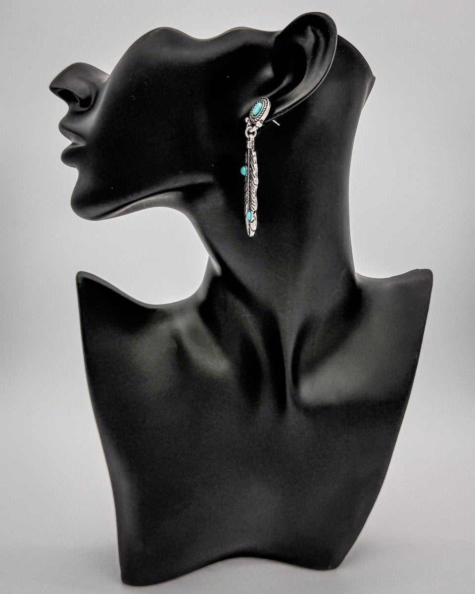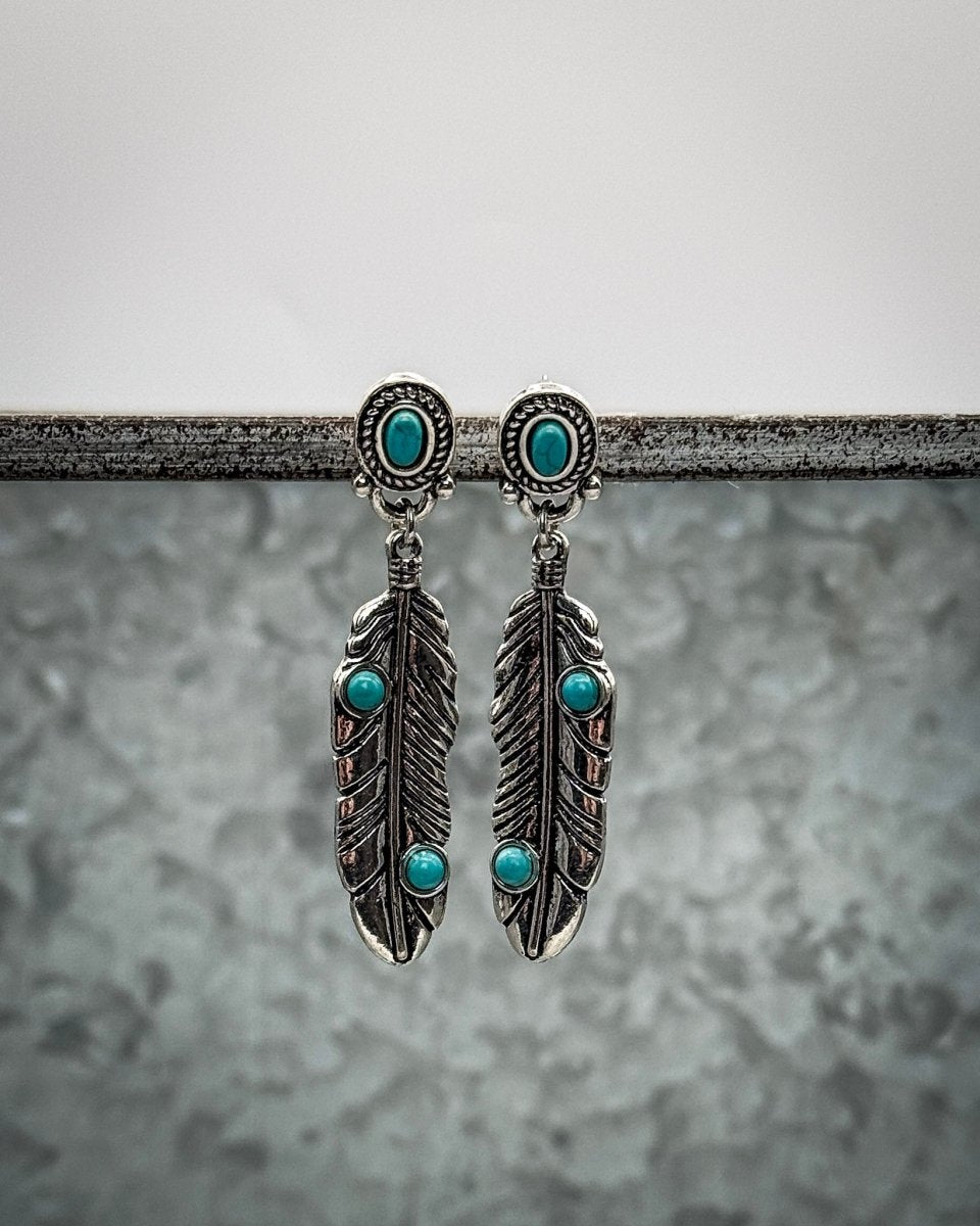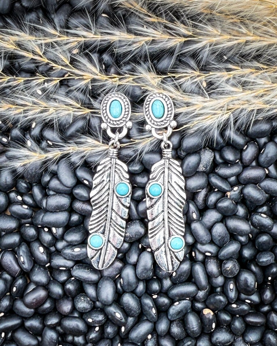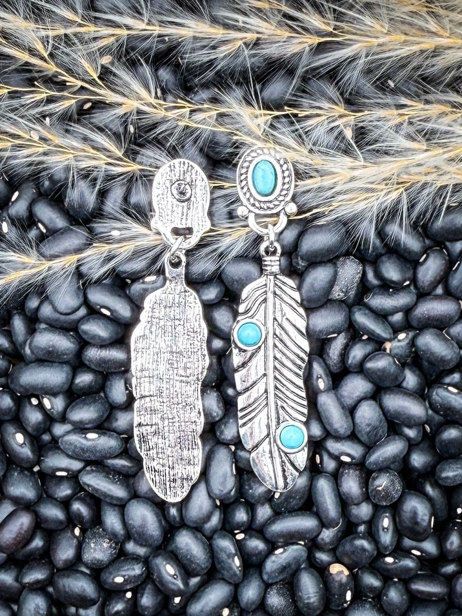 These turquoise feather dangle earrings bring together classic western symbolism and everyday wearability. Designed with detailed silver-tone feather pendants and vibrant turquoise stone accents, this pair adds movement, color, and just the right amount of statement to any outfit. The elongated feather silhouette creates a flattering drop that draws the eye without feeling heavy or overdone.