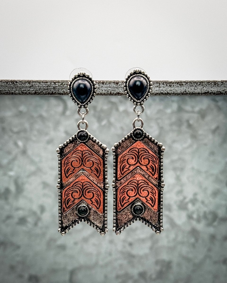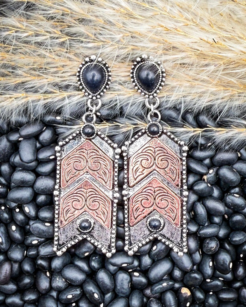 These chevron dangle earrings bring a bold mix of western detail and modern edge, designed to stand out without feeling overdone. Featuring layered chevron panels with warm copper-tone accents and dark stone details, this pair delivers strong contrast and eye-catching texture. The mixed metal finish gives them a handcrafted look that pairs beautifully with denim, leather, and everyday western staples.