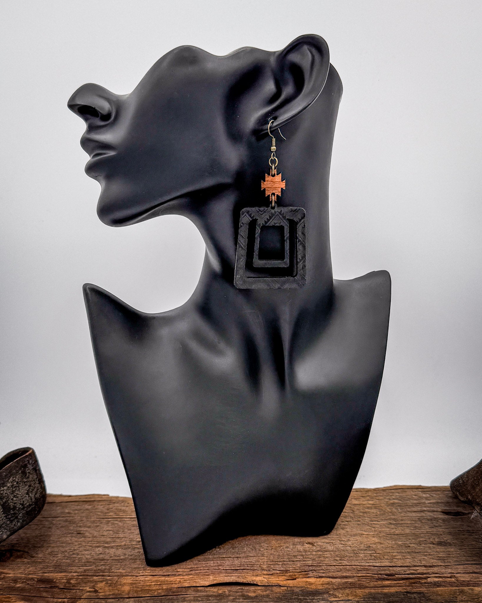 • Sleek, modern, and subtly western, these wooden cutout earrings bring bold structure to your accessory collection. Designed in a deep matte black finish, the layered square silhouette features an engraved Aztec-inspired pattern that adds texture without overpowering the look. The open geometric design keeps them lightweight while delivering strong visual impact.