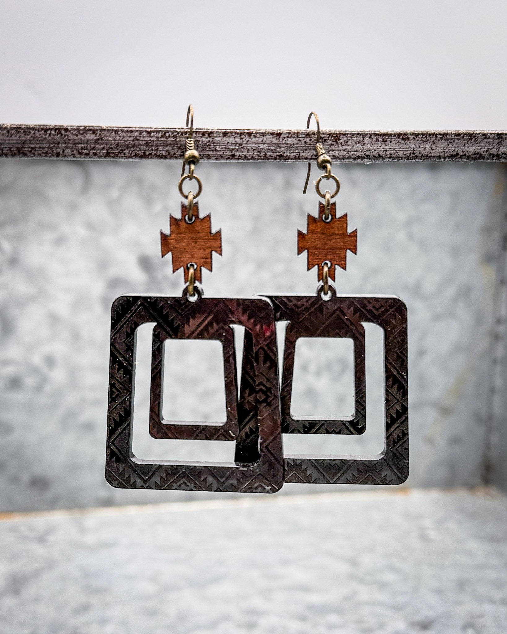 Suspended from a carved wooden accent and finished with antique bronze fishhook hardware, this pair blends natural elements with contemporary edge. The double square cutout creates dimension and movement, making them a standout piece that still feels refined and wearable. Style them with monochrome outfits for a bold statement or pair with denim and boots for a clean western finish.