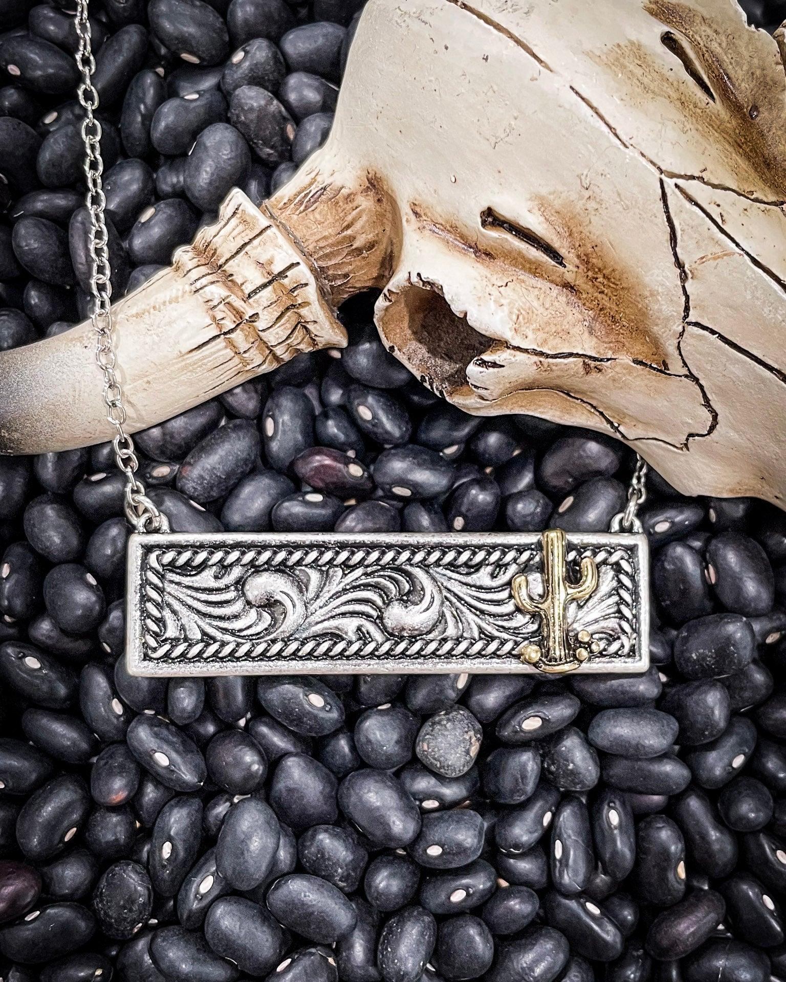 The Arizona Fashion Bar Necklace brings a warm, desert inspired touch to your everyday style. Designed with a silver tone rectangular bar pendant, this necklace features engraved scrollwork that adds subtle western character without overwhelming your look. A small gold tone cactus accent rests neatly in the corner of the pendant, offering a soft nod to desert landscapes and wide open spaces.