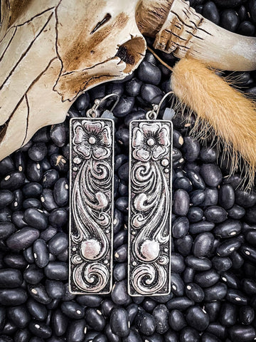 Crafted with a bold 2.3-inch bar silhouette, the Dakotas are lightweight enough for everyday wear but just dramatic enough to turn some heads. Each earring is cast with a vintage-inspired floral design that feels equal parts western heirloom and modern statement. It’s like wearing a little piece of the prairie sky—elegant, earthy, and wild in the best way.