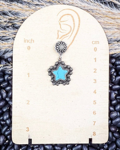 Featuring a faux turquoise star framed in vintage-style silver detailing, they bring just the right amount of sparkle and spirit to your look. The dangle design catches the light beautifully, while the floral concho-style studs up top add a classic touch that nods to old-school western charm.