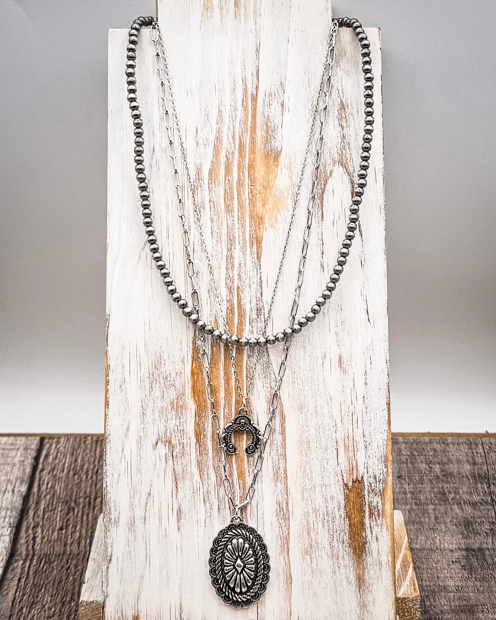 Minimal meets modern in the Greyline Layered Necklace — a layered silver-tone design that brings effortless polish to any look. Featuring three delicate chains of varying lengths, this piece combines dainty linked metalwork with a bold center pendant and a touch of hammered texture. It's the perfect blend of simple and statement-making.