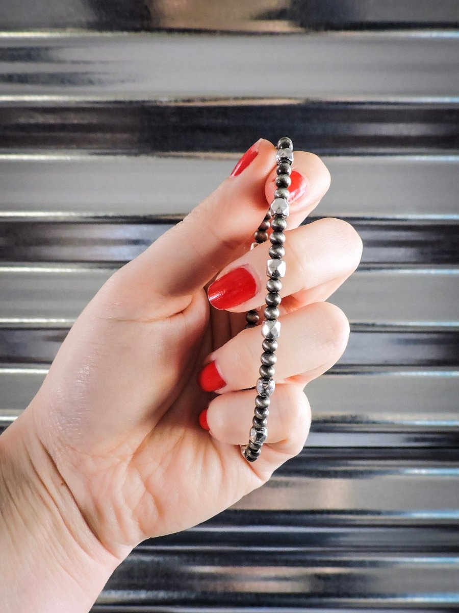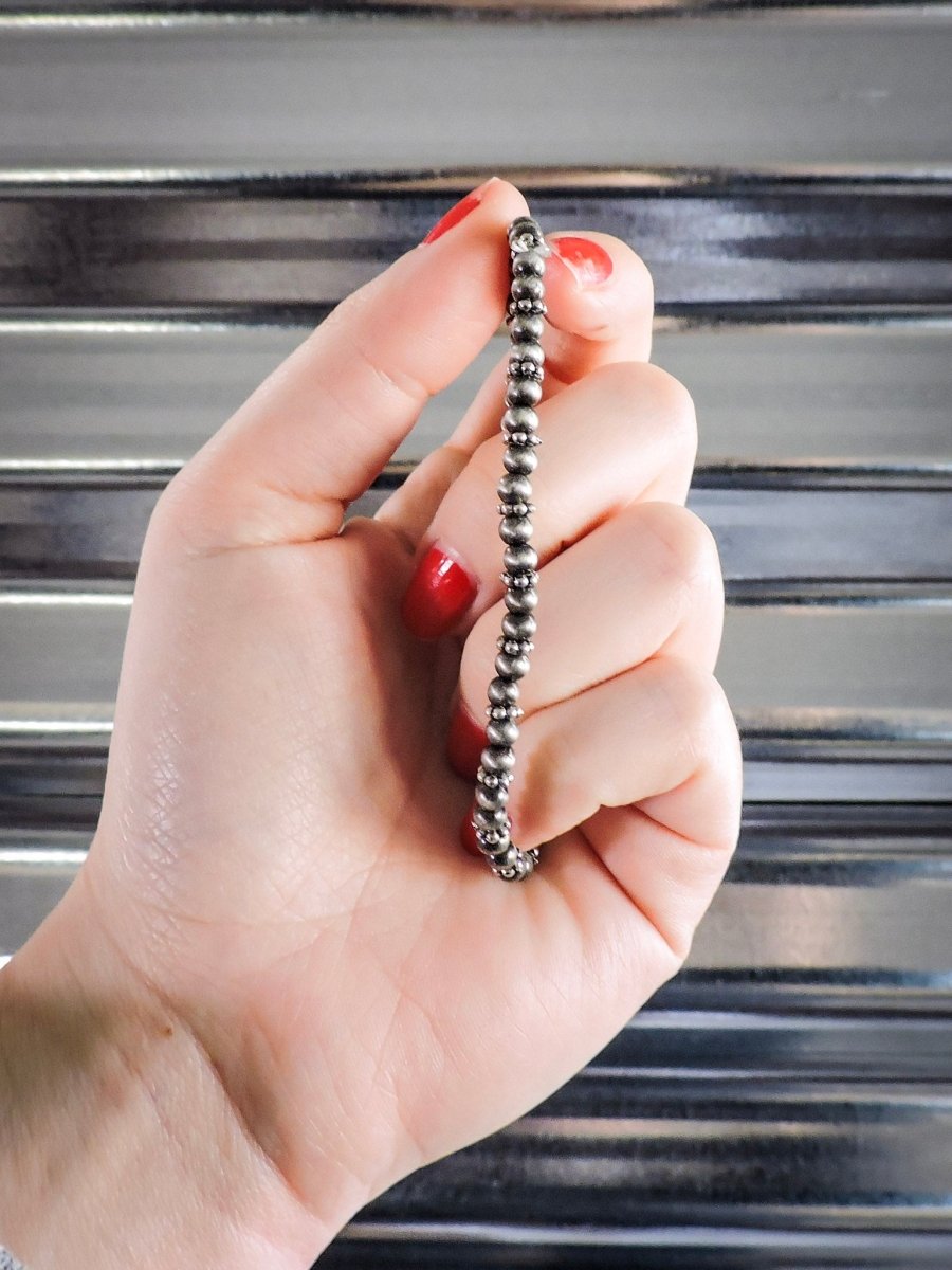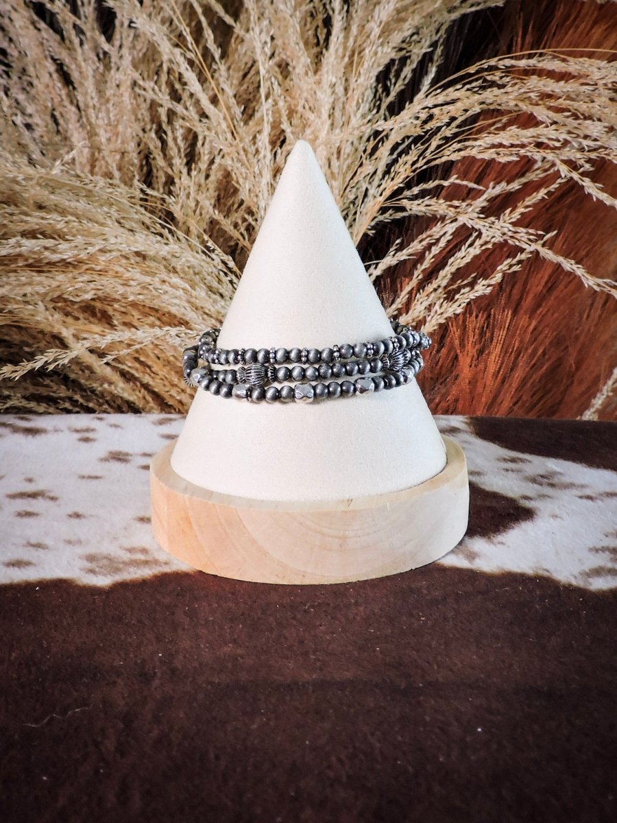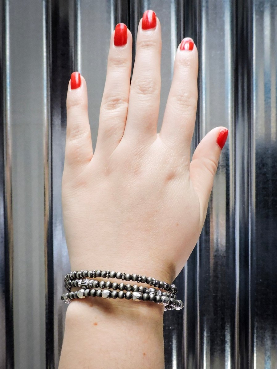 • Leanne is the kind of bracelet set that delivers effortless layering in an instant. This stackable trio features faux Navajo pearl beads in a softly burnished silver tone, offering a mix of smooth, faceted, and textured designs that add dimension without feeling too bold. Each bracelet has its own subtle character, creating a cohesive stack that feels elevated while still easy enough for everyday wear.