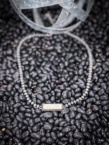 The Lexi Navajo Style Fashion Stone Choker is a delicate yet distinctive piece that blends southwestern tradition with a clean, modern feel. Made with 4mm silver-tone faux Navajo pearl beads, this choker is accented by a rectangular faux stone centerpiece framed with detailed silver beading for just the right touch of texture.