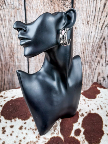 The Nova Stud Fashion Hoop Earrings bring together the boldness of a hoop with the comfort and ease of a stud. Crafted in a silver-tone finish with an antique-style patina, each half-hoop is detailed with intricate western stamping and framed by rope-style edging for extra texture. At both the top post and the bottom edge, a faux pink stone adds a soft pop of color, balancing the rugged detailing with a touch of femininity.