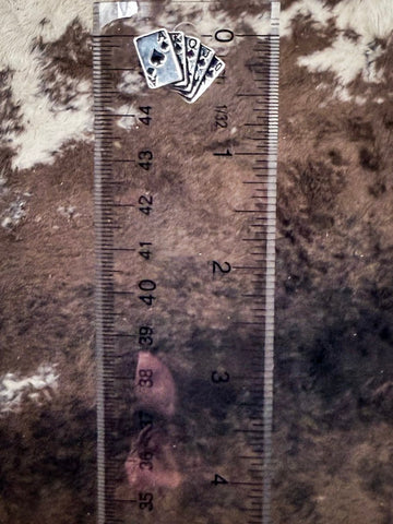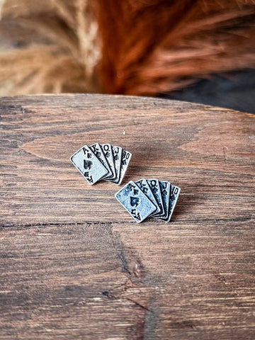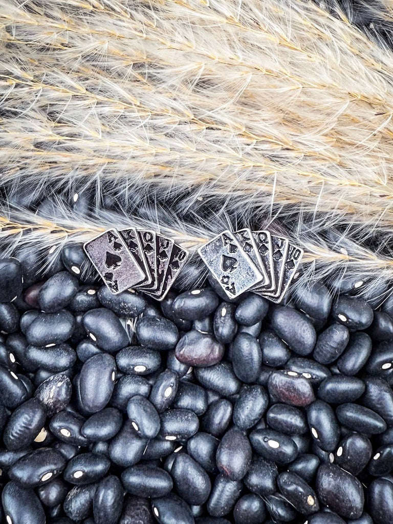 Crafted with a silver-tone finish and detailed with the full winning hand—Ace, King, Queen, Jack, and Ten—these earrings are small in size but big on personality. They’ve got that vintage playing card look with etched suit symbols and shadowed edges that make every letter pop. It’s that perfect mix of rustic charm and rebel soul, made for the woman who plays her cards with confidence.