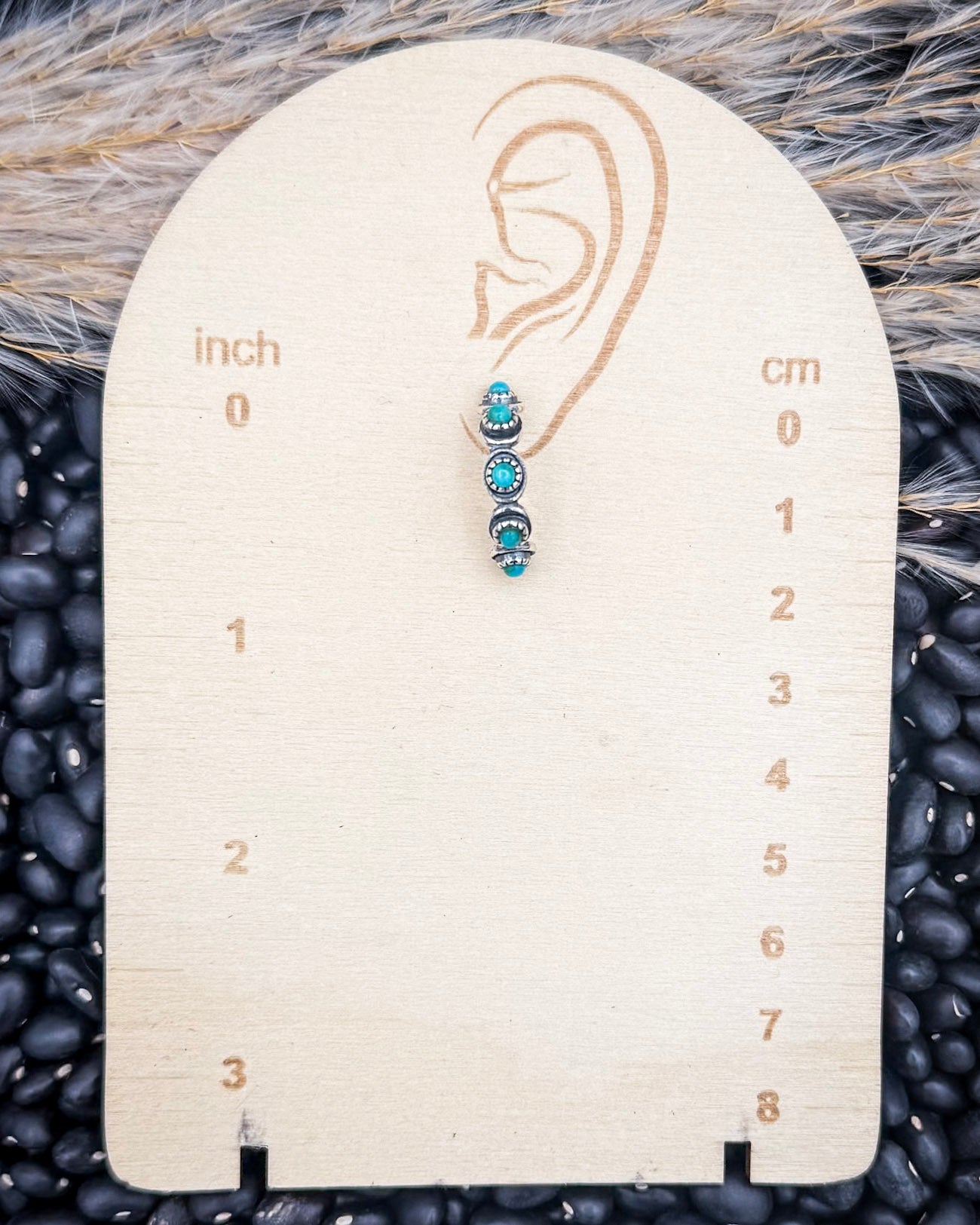 Sleek, timeless, and full of character — the Sam Turquoise Hoop Earrings are the perfect everyday accessory with just the right touch of artisan charm. Each 20mm sterling silver hoop features five genuine turquoise cabochons set in detailed silver bezels, bringing a subtle pop of color and craftsmanship to your look.