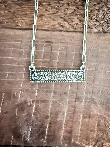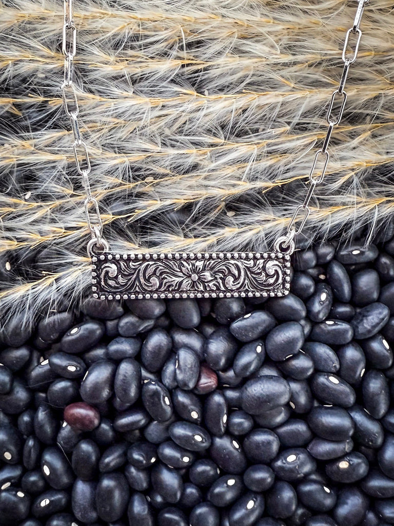 Crafted with the highest quality materials, the Western Bar Necklace offers both durability and elegance, ensuring that it withstands the test of time. The bar pendant is adorned with western etching in a delicate rectangle shape, exuding a natural and earthy charm reminiscent of the Southwest. The pendant hangs gracefully from a sleek silver chain, complementing the rustic yet refined aesthetic of the piece.
