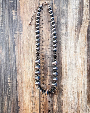 Crafted with graduated faux Navajo pearls in a burnished copper tone, each bead carries the feel of something treasured—like a piece passed down through generations. The soft sheen and warm hue evoke desert sunsets, worn leather, and open skies, giving this necklace a rich personality that stands out in all the right ways.