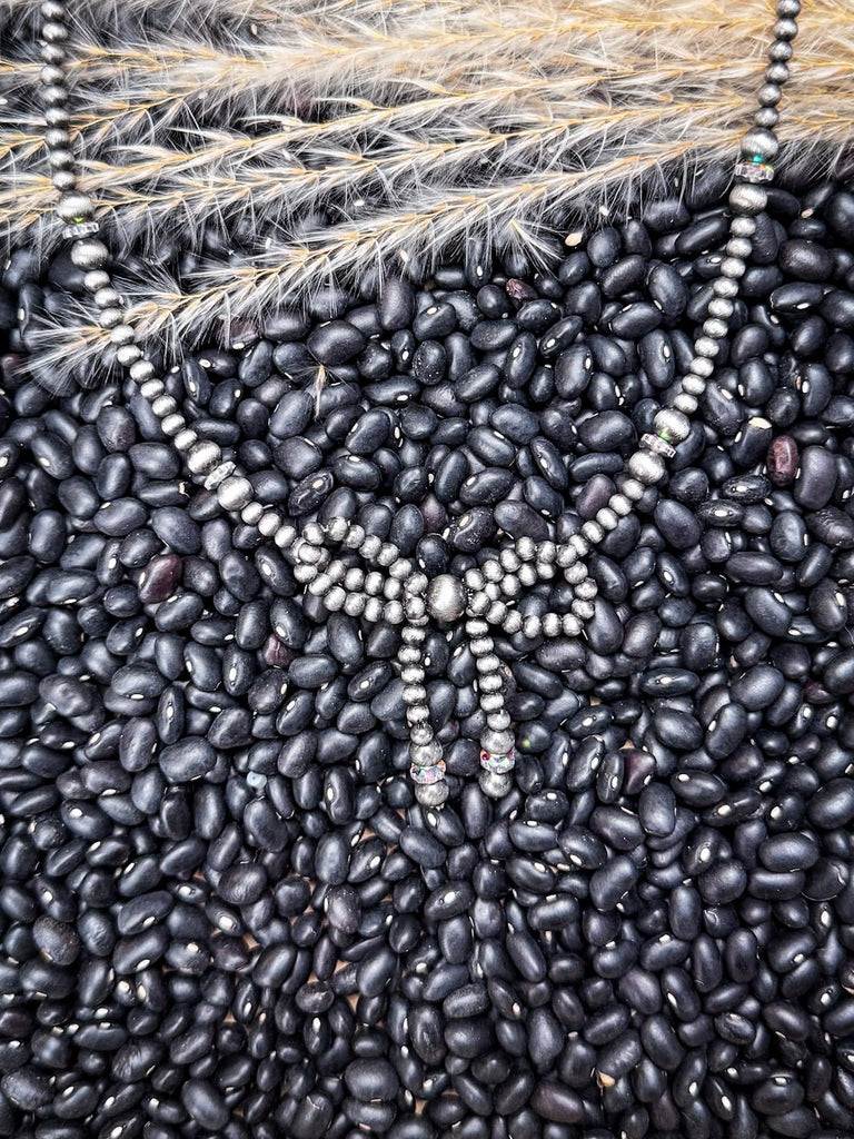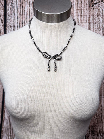 Crafted with a string of glimmering faux Navajo pearls, the Susannah features that rustic, oxidized silver look we all love—without the hefty price tag. Each bead is spaced just right to catch the light, shimmer subtly, and give that lived-in, loved-on look that feels straight out of a western romance novel. But the real showstopper? That beaded bow detail front and center. Dainty, elegant, and just a little flirty, it gives this necklace a soft, ladylike feel while still staying true to its Southwestern roots.