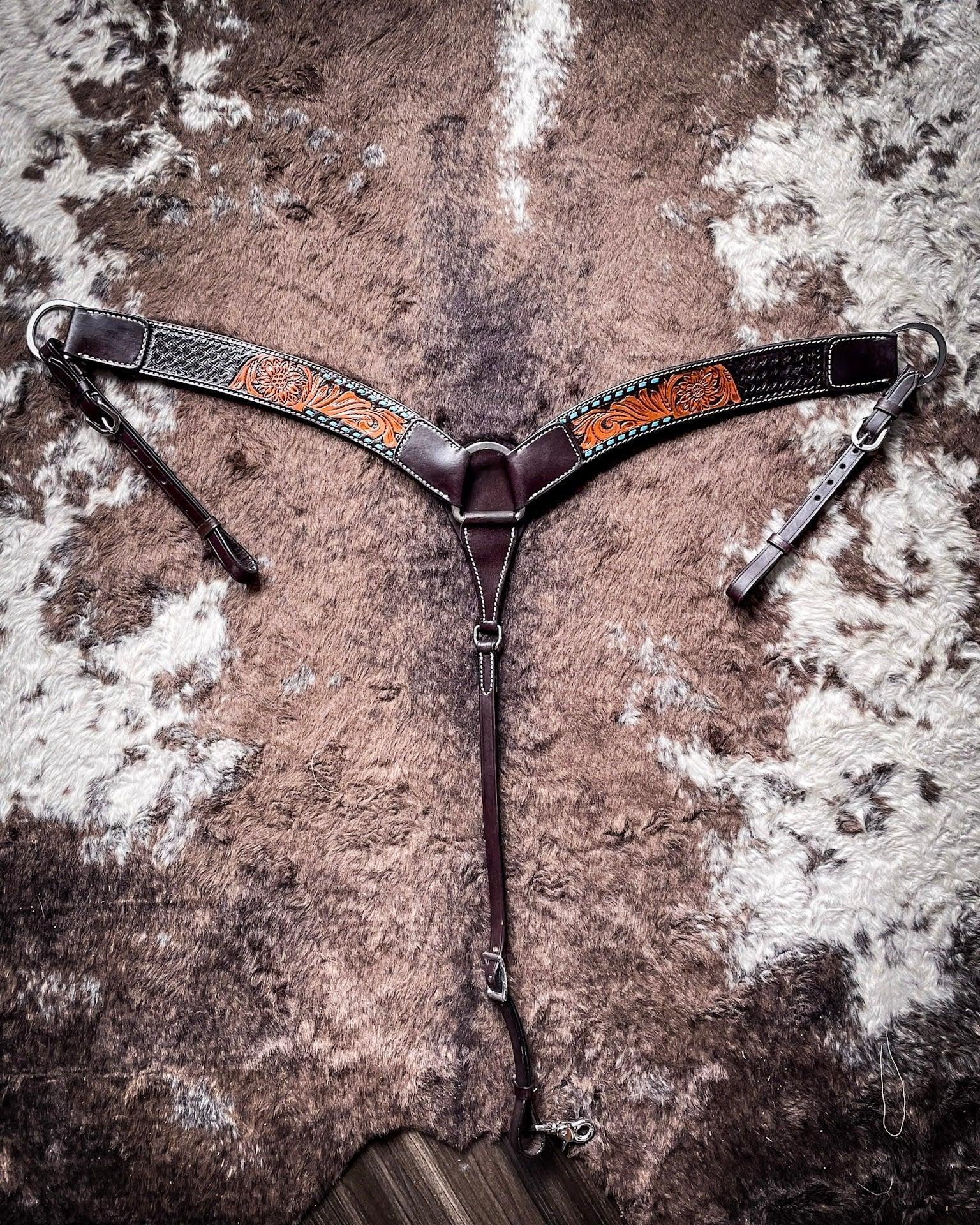 The Royal King Benton breast collar has an eye-catching look. Combining medium oil hand tooling on a rich dark oil background with a pop of color provided by the turquoise buckstitch. Stainless steel hardware, adjustable tugs, and center strap.