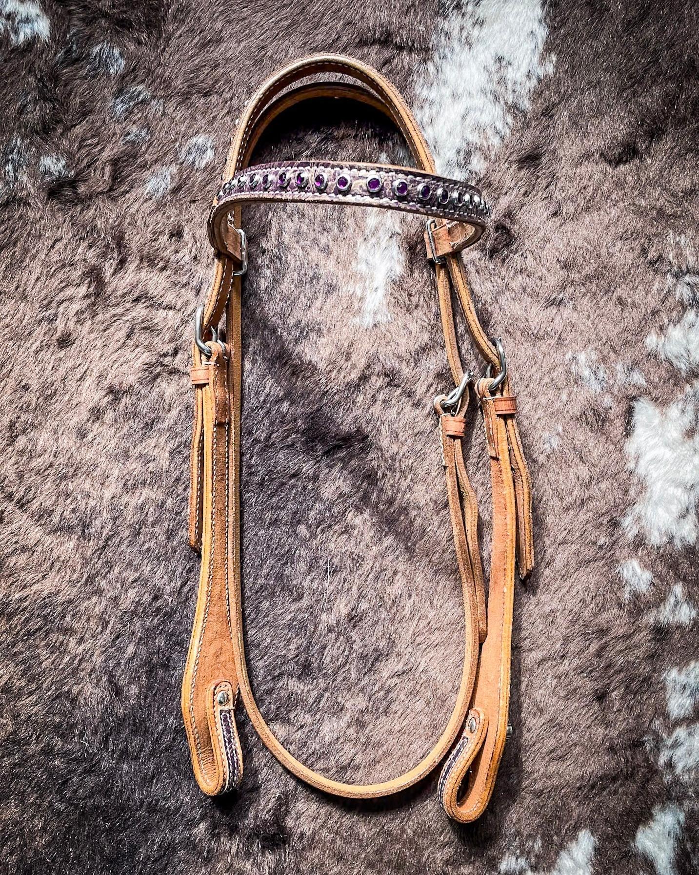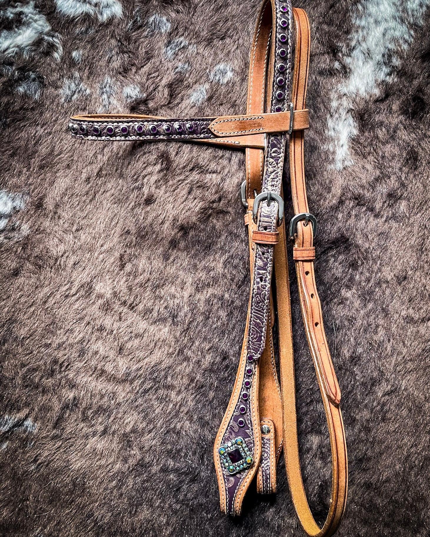 The Sweet Pea headstall features gorgeous purple and gold floral print overlay and fun matching purple dot accents. The screw bit ends are adorned with unique square, silver conchos with iridescent Swarovski crystals and large purple gems.